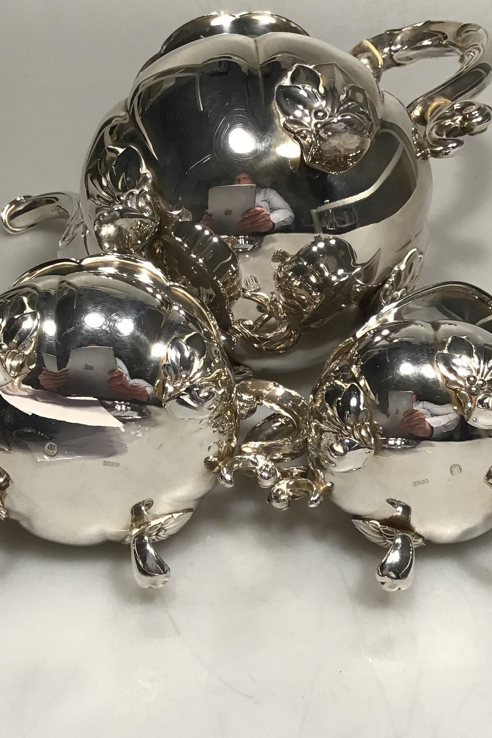 Cohr Sølv Ligeknækket Kaffestel Kaffekande (H 22 cm Vægt 754gr )flødekande (H 9 cm Vægt 139gr )og sukkerskål (H 8.5 cm Vægt 188gr)