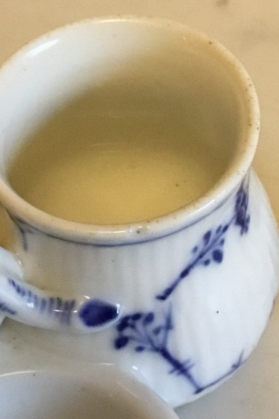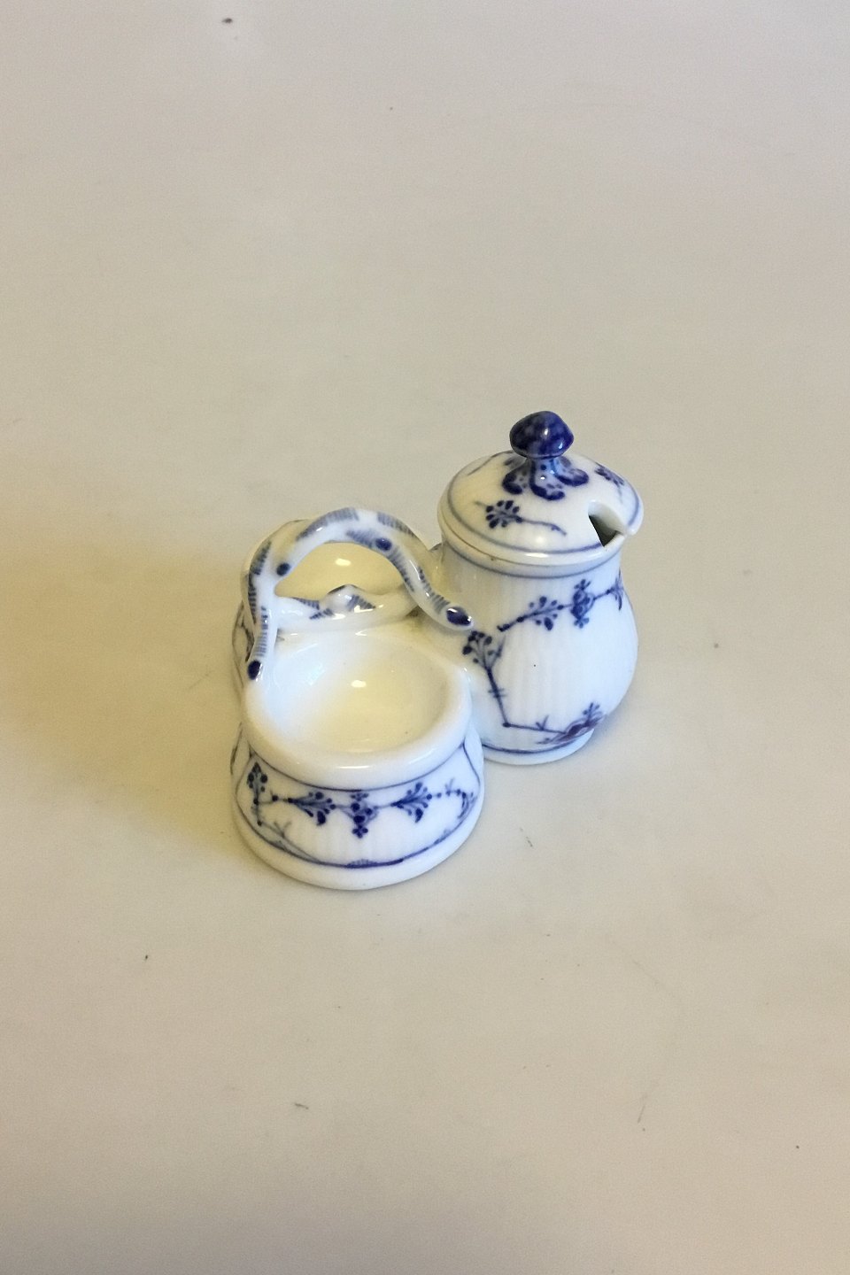 Royal Copenhagen Musselmalet Riflet Salt, Peber og Sennep No 63. Måler 8cm x 9 cm x 7 cm. Lille fabrikationsfejl på kant og mini afslag på låg