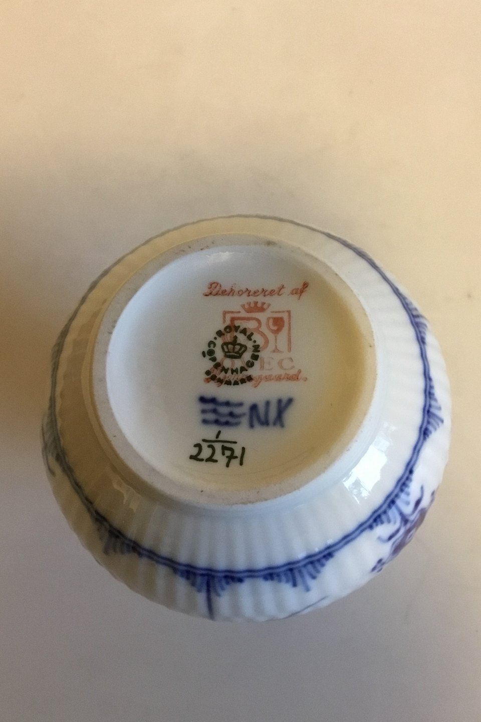 Royal Copenhagen Musselmalet Riflet Vase No 2271. Måler 12,5 cm. Med logo fra "ACN Missionshotellet"