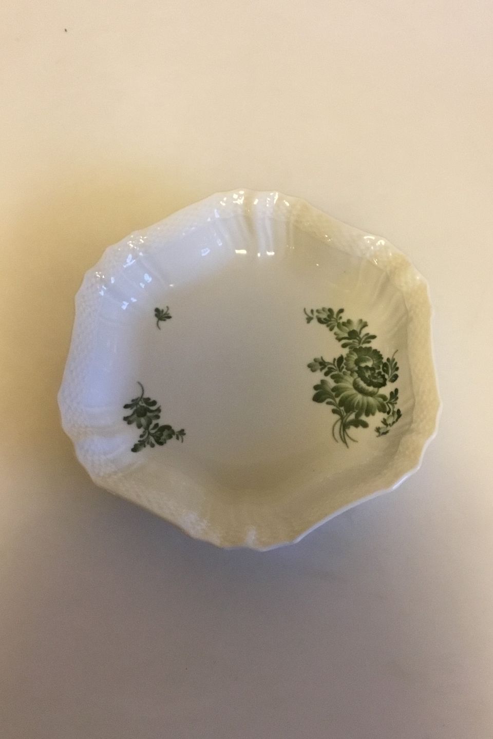 Royal Copenhagen Grøn Blomst Svejfet 6-kantet fad No 1527. Måler 21 cm