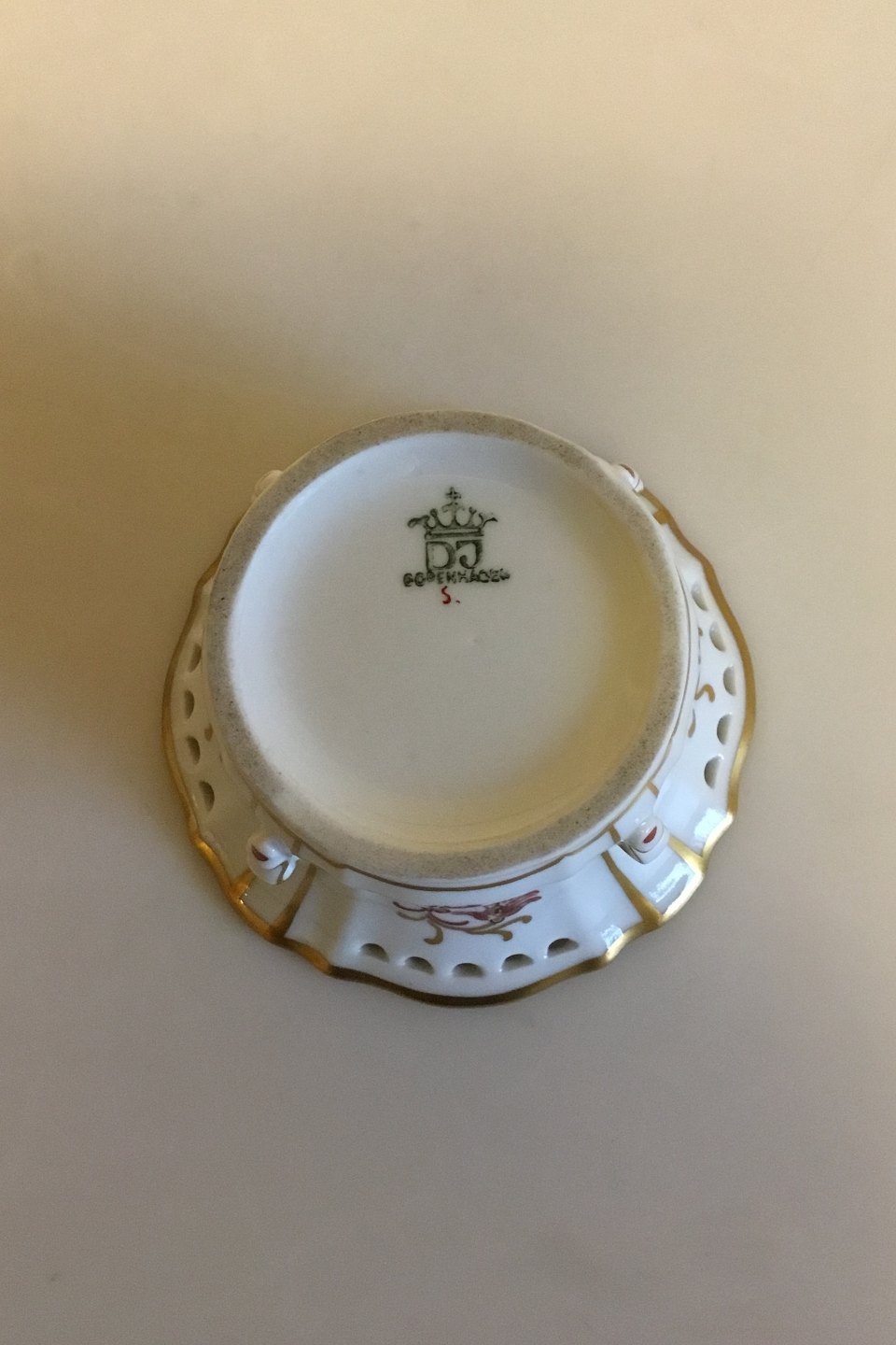 Dahl Jensen Dronning Sukkerskål med guld og gennembrudt kant. Måler 10,5 cm