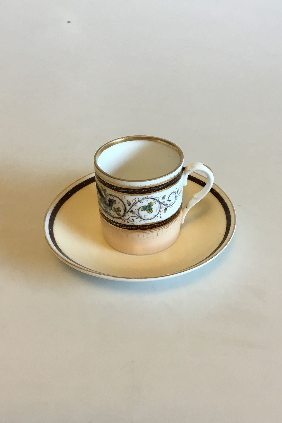 Carl Tielsch / Altwasser Mocca Cup decorated with flower frieze with dragons and gold. From 1875-1909. Measures cup: 5.6 cm / 2 13/64 in. x 5.4 cm / 2 1/8 in. dia. Saucer: 12.5 cm / 4 59/64 in. dia.