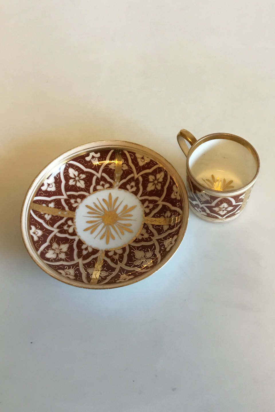 Carl Tielsch / Altwasser Mokkakop dekoreret med blomsterfrise i rødt og guld. Fra 1875-1909. Måler kop: 5,1 cm x 5 cm dia. Underkop: 12 cm dia. Kop med afslag på underkanten