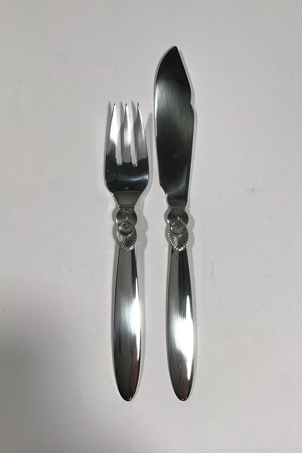 Georg Jensen Sterling Sølv Kaktus Fiskebestik til 8 pers(16 dele) No 061 Gaffel 16.2 cm No 062 Kniv 19.5cm