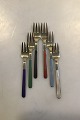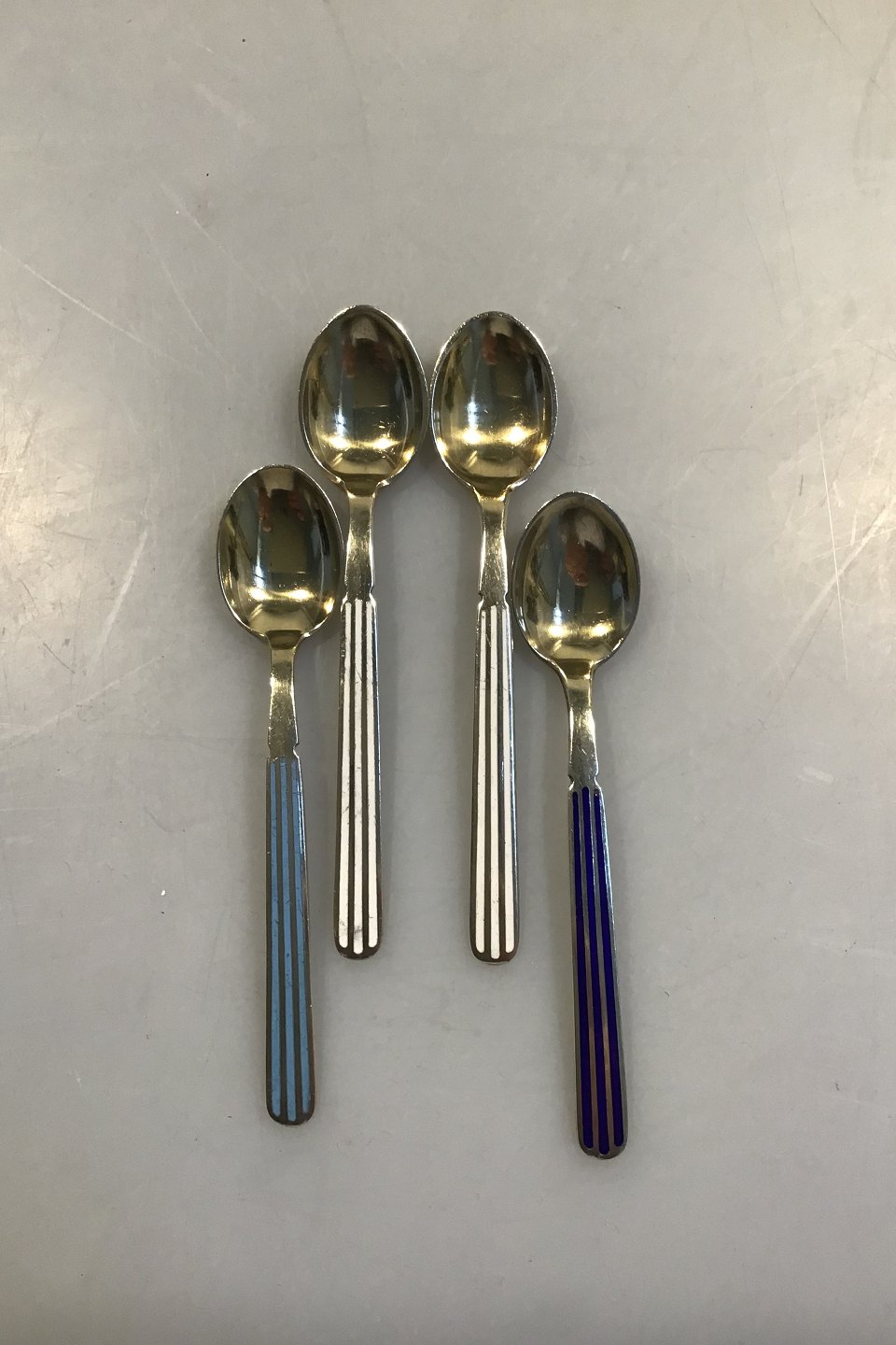 A Michelsen Sterling Sølv 4 Kaffeskeer og 6 Kagegafler Forgyldt delvist emaljebelagt Kaffeskeer 10.2 cm Kagegafler 12.7cm Samlet vægt 160 gr