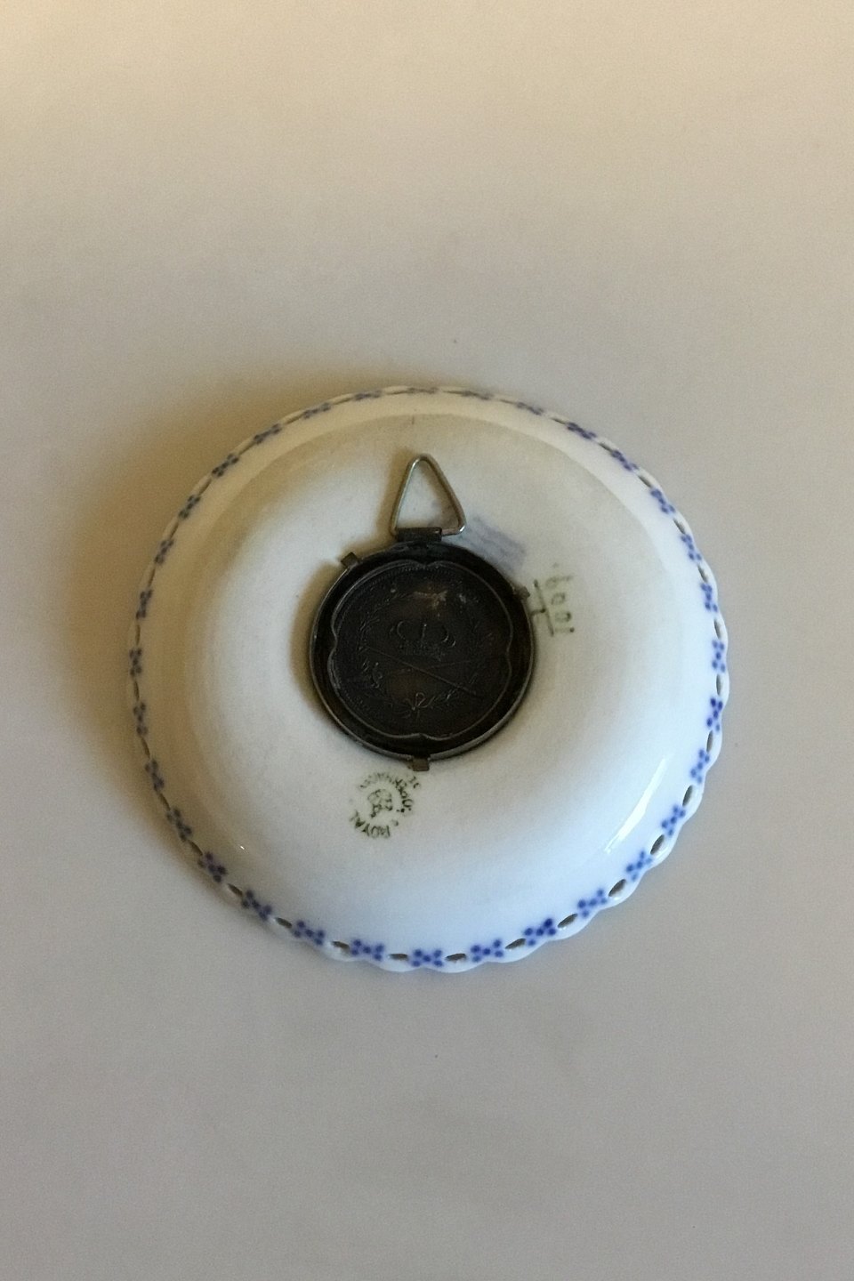 Royal Copenhagen Blue Fluted Full Lace Candle Drip Cup with 2-Crown coin with Christian VIII og Caroline Amalie, 1860. No 1009. Measures 9.4 cm / 3 45/64 in.