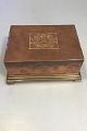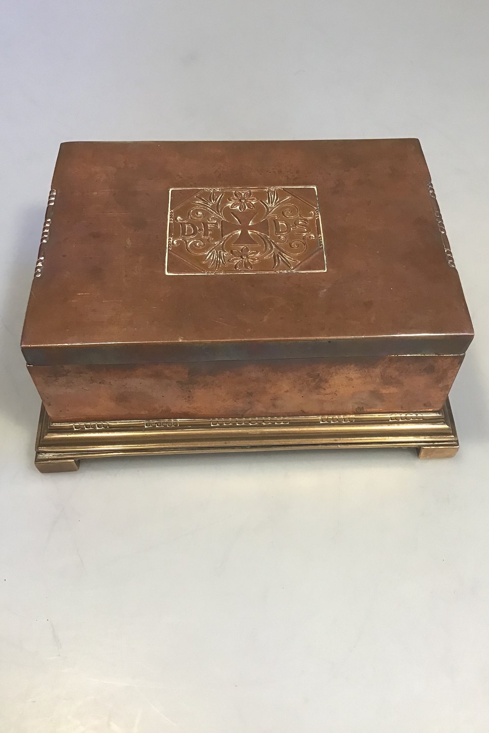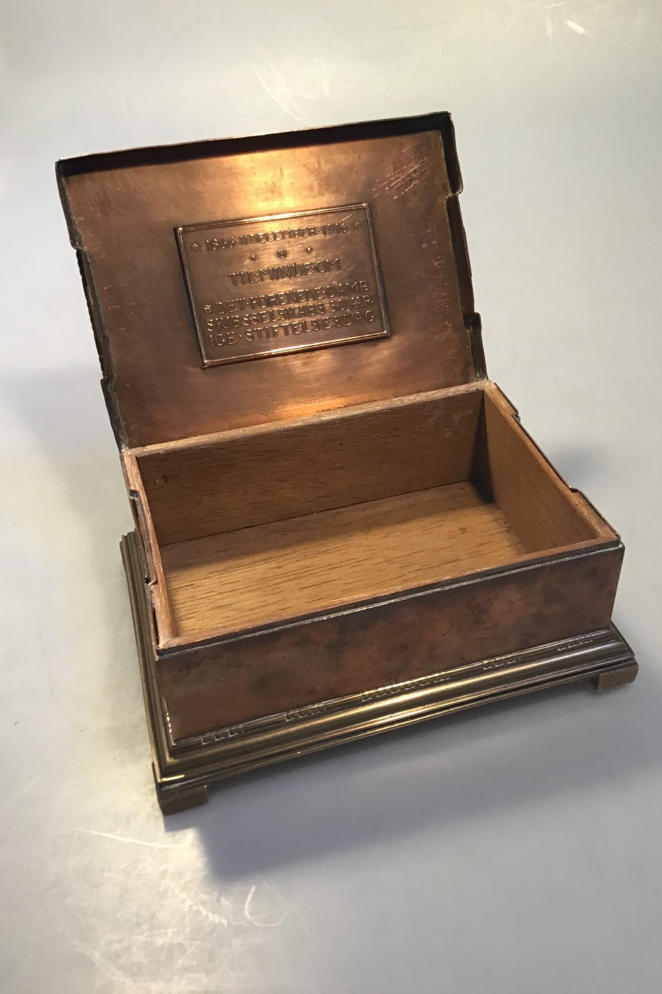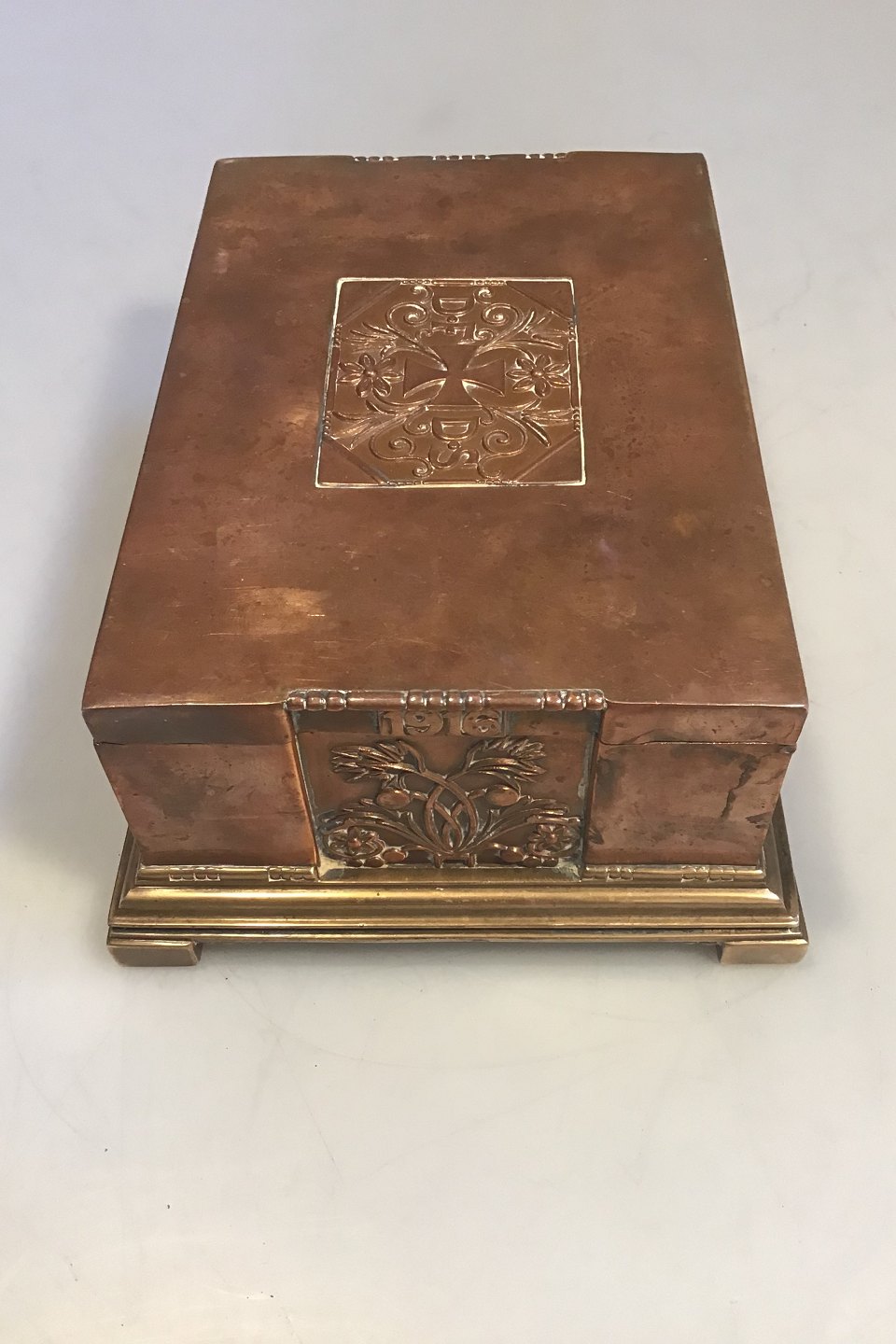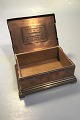 Johan Rohde for Georg Jensen. Cigarbox of copper and brass, wood linind. Decorated with art noveau motifs and DFDS 1866-1916. Inside plaque: Til Minde Om Det Forenede Dampskibsselskabs 50 Aarige Stiftelsesdag.(In commemoration of United Steam Ships 50th inauguration) H. 8,5 W. 19 D. 14. cm.(H 3.34" W 7.48" D 5.51")