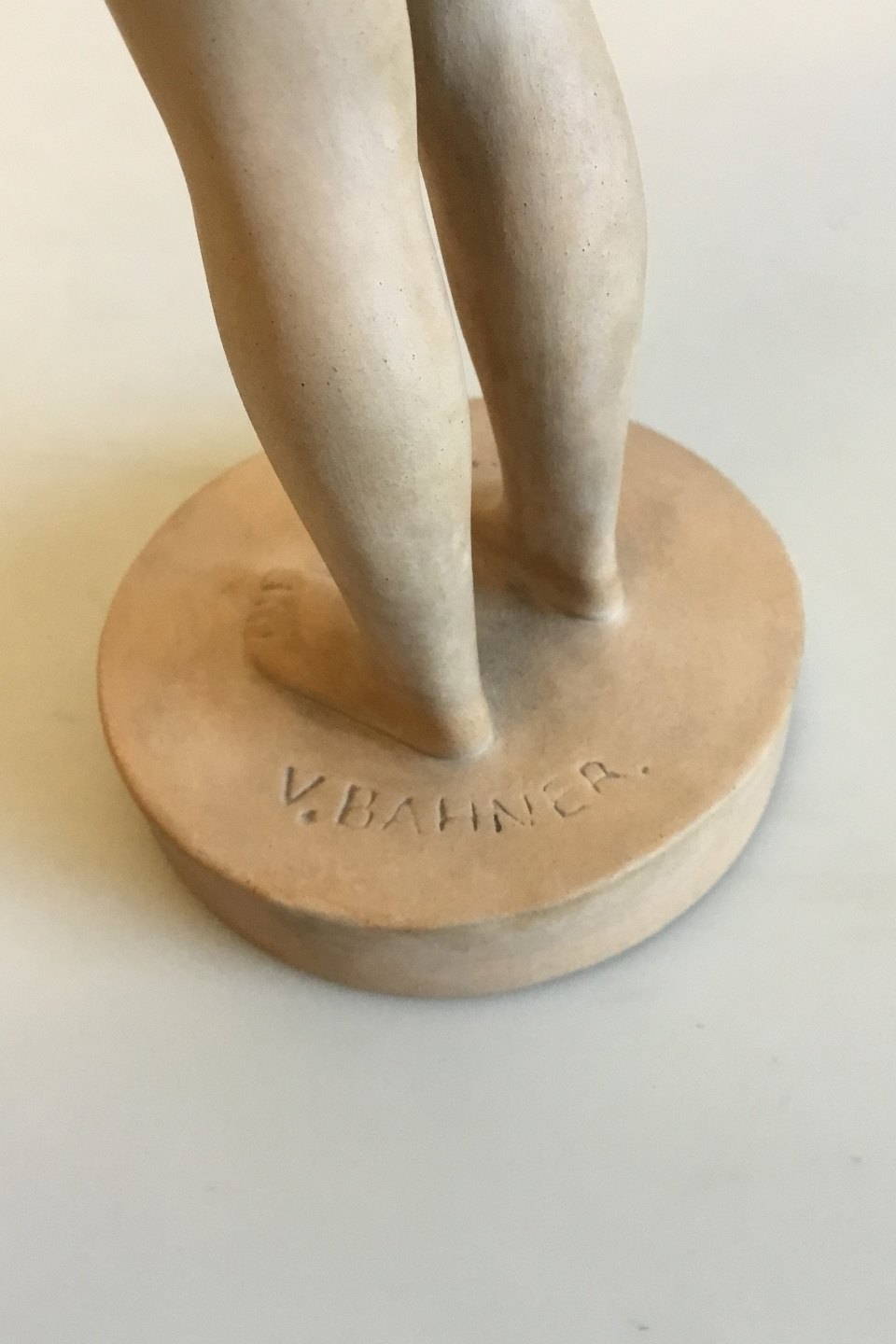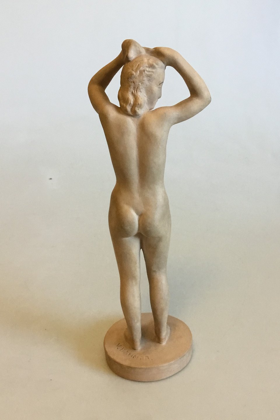 P. Ipsens Enke Terracottafigur af stående nøgen kvinde No 910. Designet af V. Bahner. Måler 24 cm