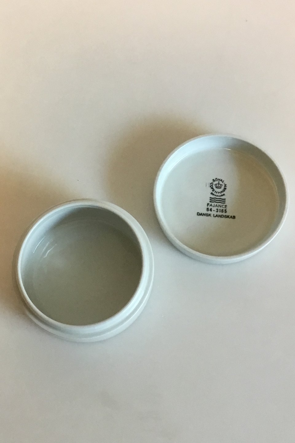 Royal Copenhagen Faience Bonbonniere "Danish Landscape" No 3165. Measures 5 cm / 1 31/32 in. x 8.5 cm / 3 11/32 in. dia.