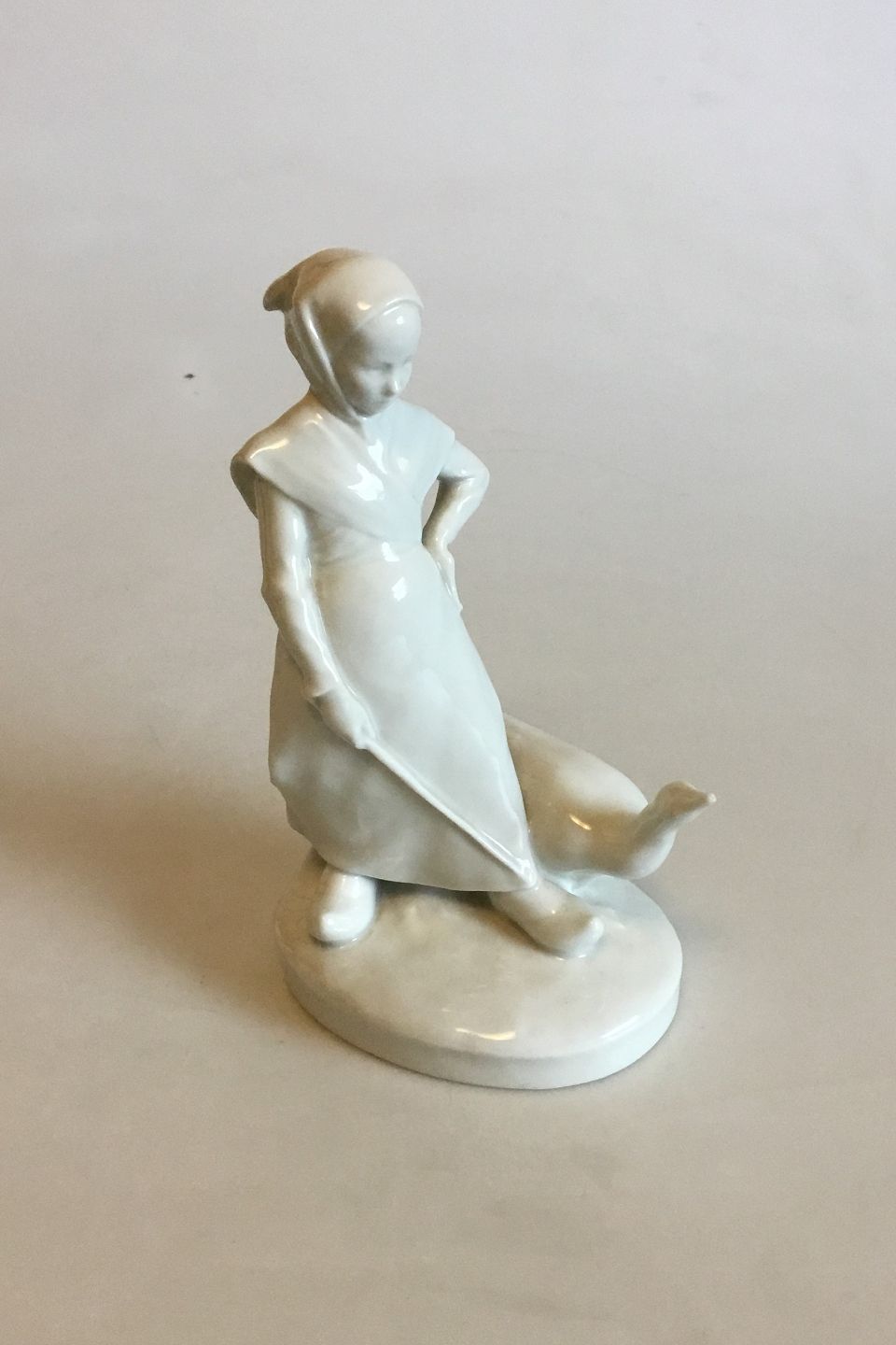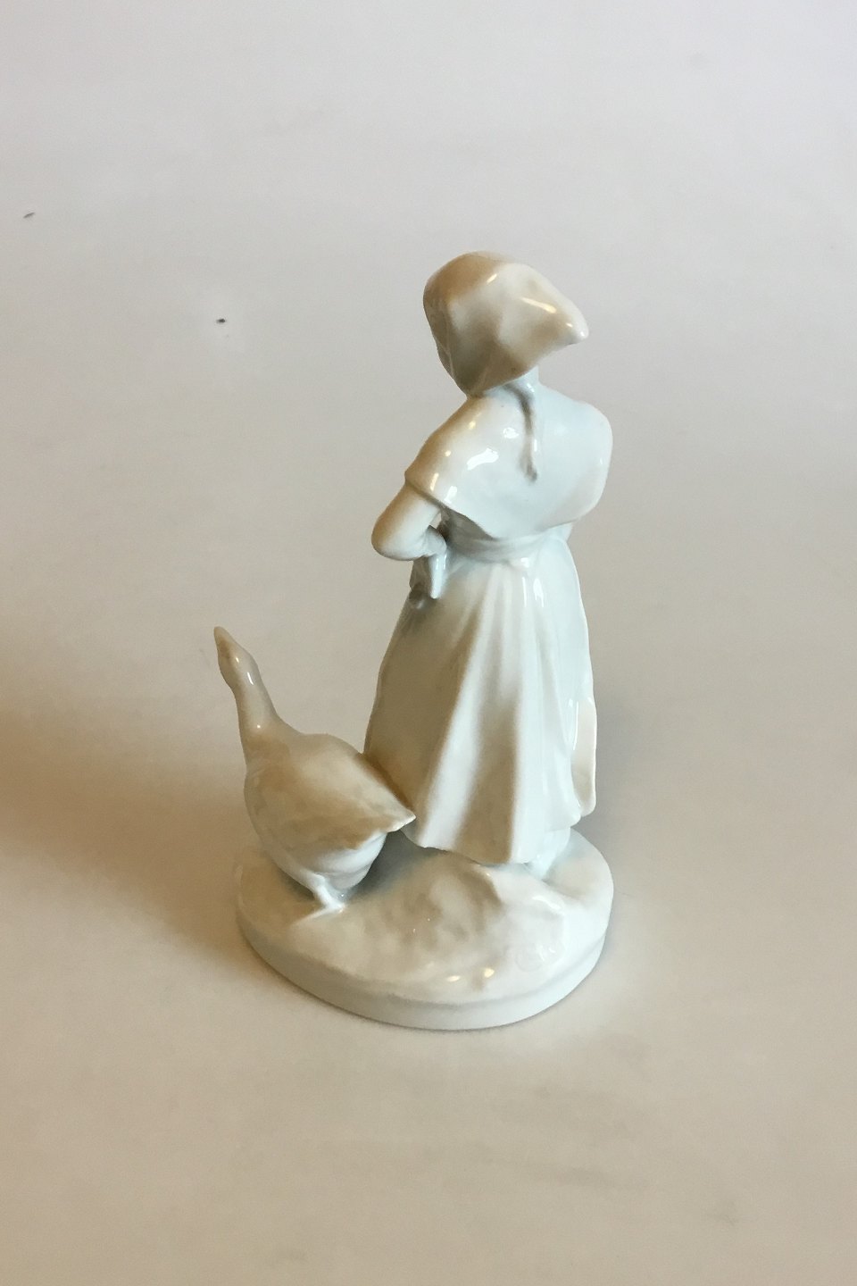 Royal Copenhagen Blanc De Chine Porcelain "Farm Girl With Goose" No 528. Measures 18 cm / 7 3/32 in.
