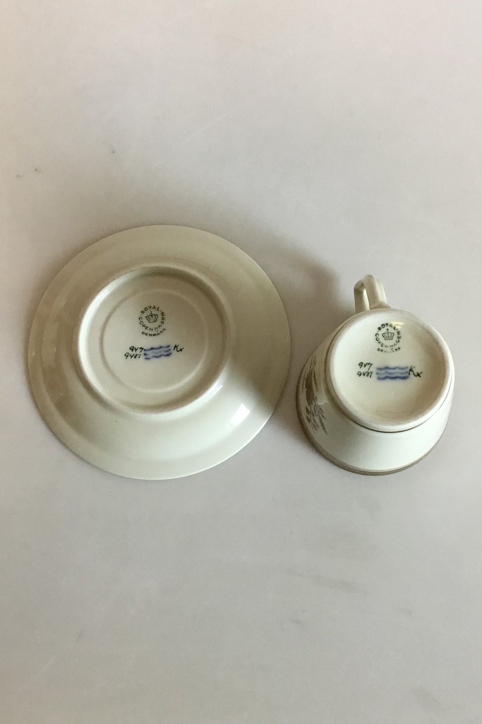 Royal Copenhagen Liselund (Old) Coffee Cup and Saucer No 947/9481. Measures Cup: 7 cm / 2 3/4 in. x 7.5 cm / 2 61/64 in. dia. Saucer: 13.4 cm / 5 9/32 in.