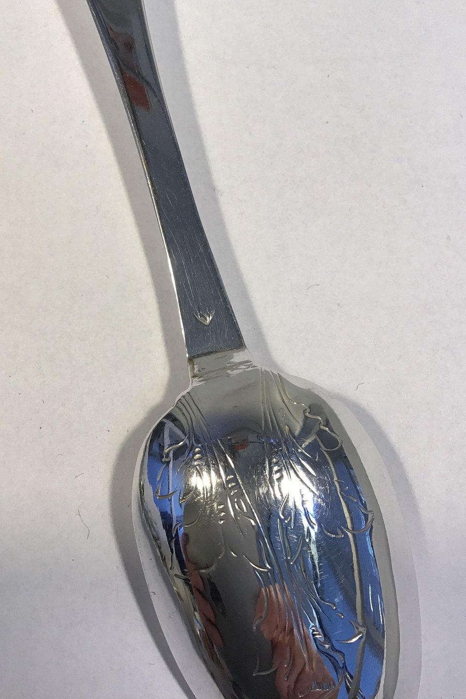 Danish Silver Spoon "Rat Tail Spoon" 1728, back of bowl engraved with rat tail and foliage including owners initials and 1728 Hallmark illegible