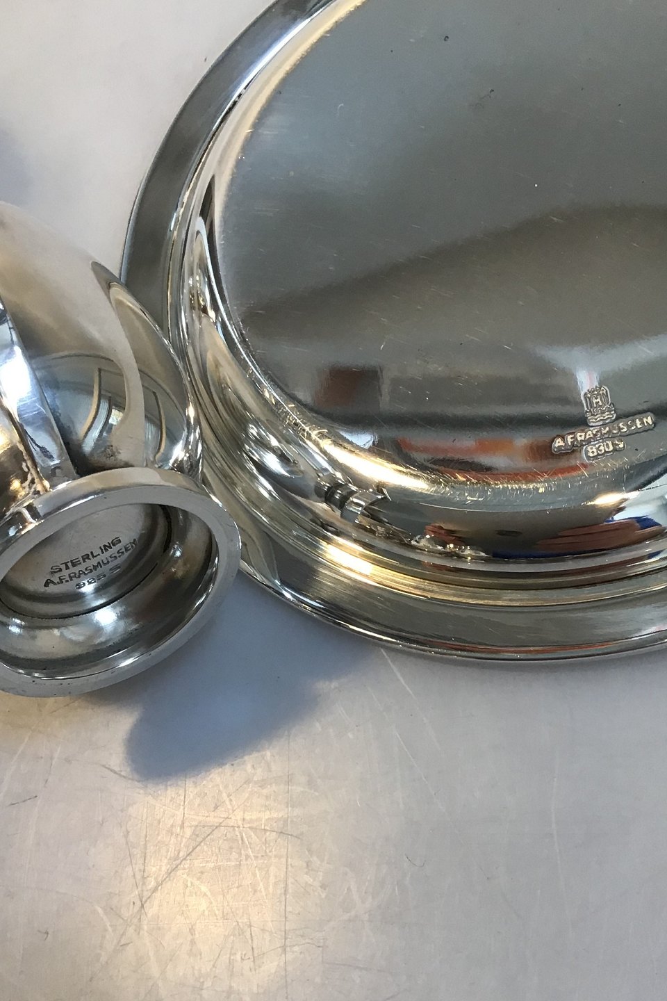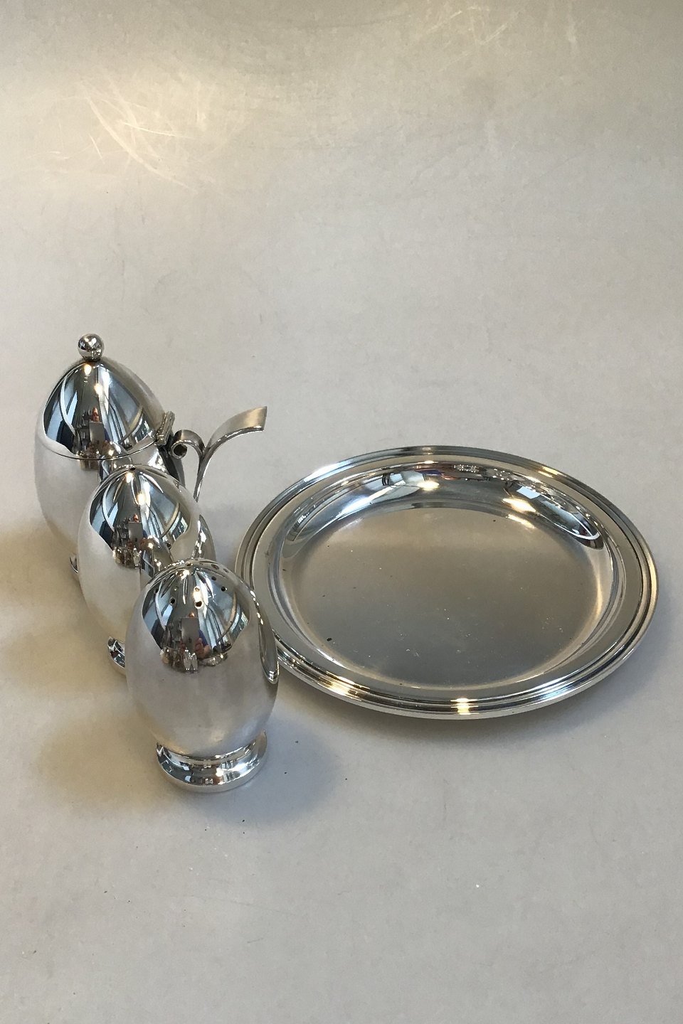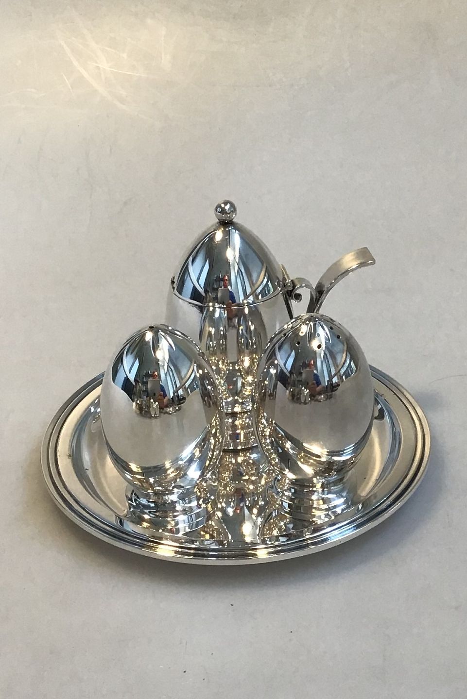 A. F. Rasmussen Sølv/Sterling Sølv Plat-de-menage Måler: H Salt 7 cm og Peber 6.5 cm, Sennepskrukke 8.6 cm med blå emalje.(Små afslag) Bakken Diam 13.5 cm