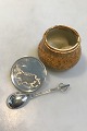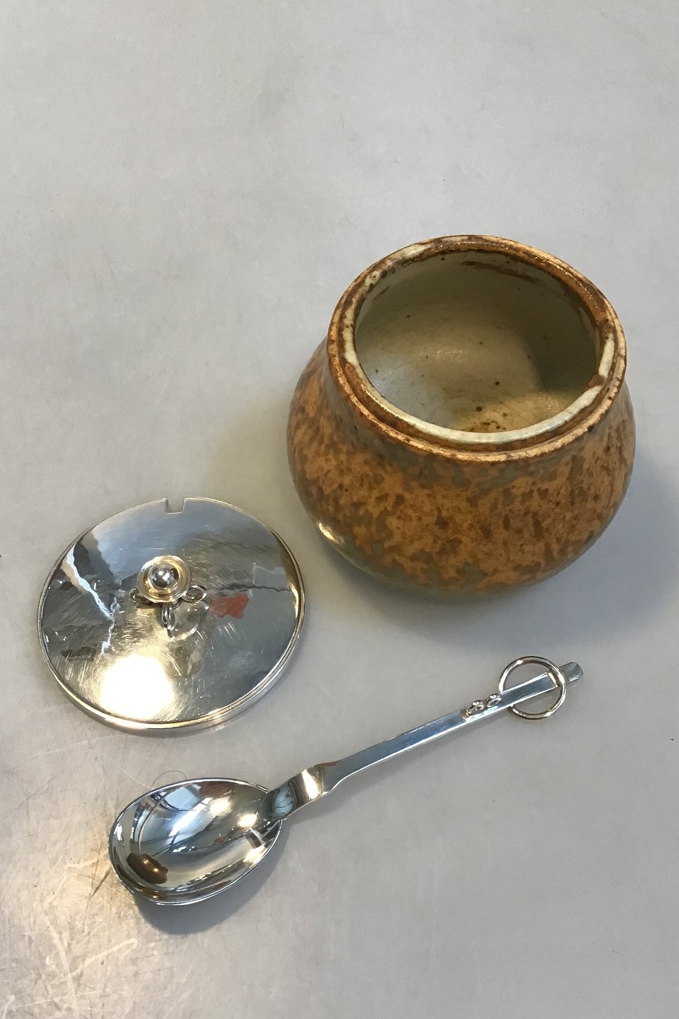 Bode Willumsen Hans Hansen Jam Jar Sterling Silver Lid and Spoon Jam Jar made of stoneware decorated with bird egg glaze in golden shades. Underneath sign. Bode Willumsens and Hans Hansens monogram 1938, lid and spoon of Sterling Silver made at Hans Hansen af Karl Gustav Hansen, lid hallmarked 1939. H. 8,5 cm.(3.34 in) incl. finial, Diam 10 cm(3.93 in) Inside with hairline