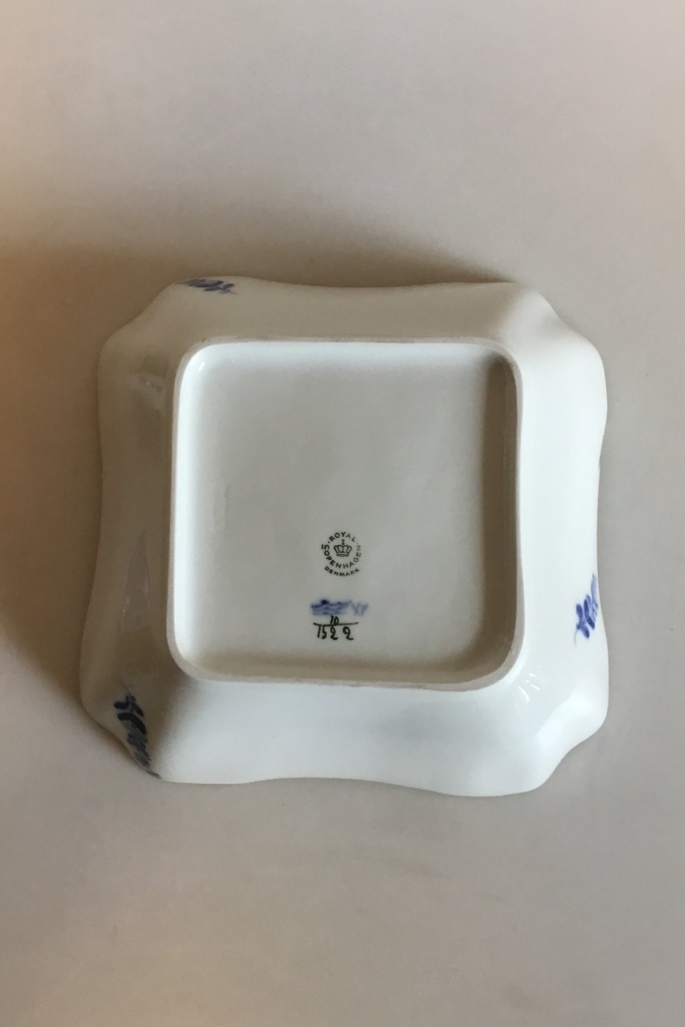 Royal Copenhagen Blue Flower Curved with Gold Square Bowl No. 1522. Measures 21.5 cm / 8 15/32 in. x 21.5 cm / 8 15/32 in.
