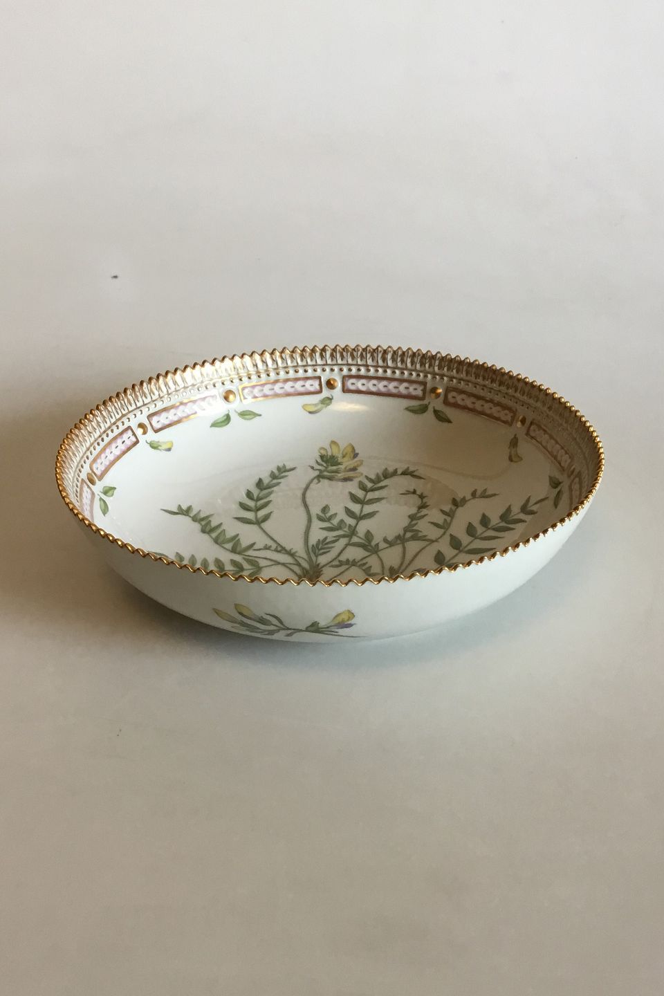 Royal Copenhagen Flora Danica Skål No 20/3503. Måler 5,1 cm x 20,3 cm dia. Latinsk navn: Astragalus uralensis Wahl. Fra 1966