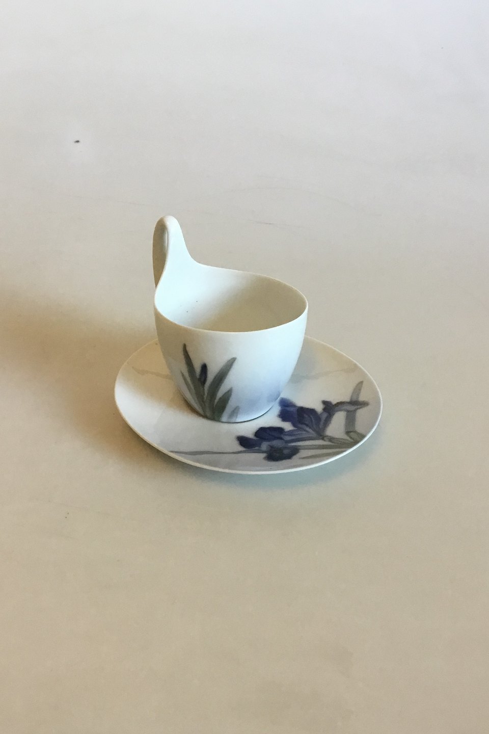 Royal Copenhagen Art Nouveau Pattern 4 High handle cup with saucer No 90/4, 1375/1052. Measures Cup: 8 cm / 3 5/32 in. Saucer: 14 cm / 5 33/64 in. x 12 cm / 4 23/32 in.