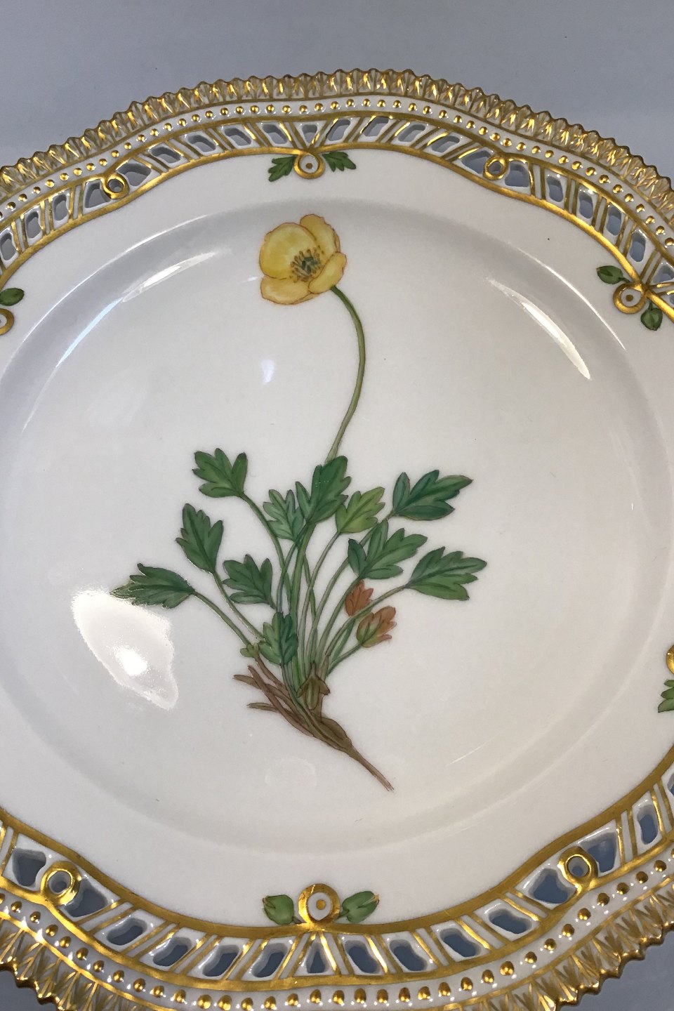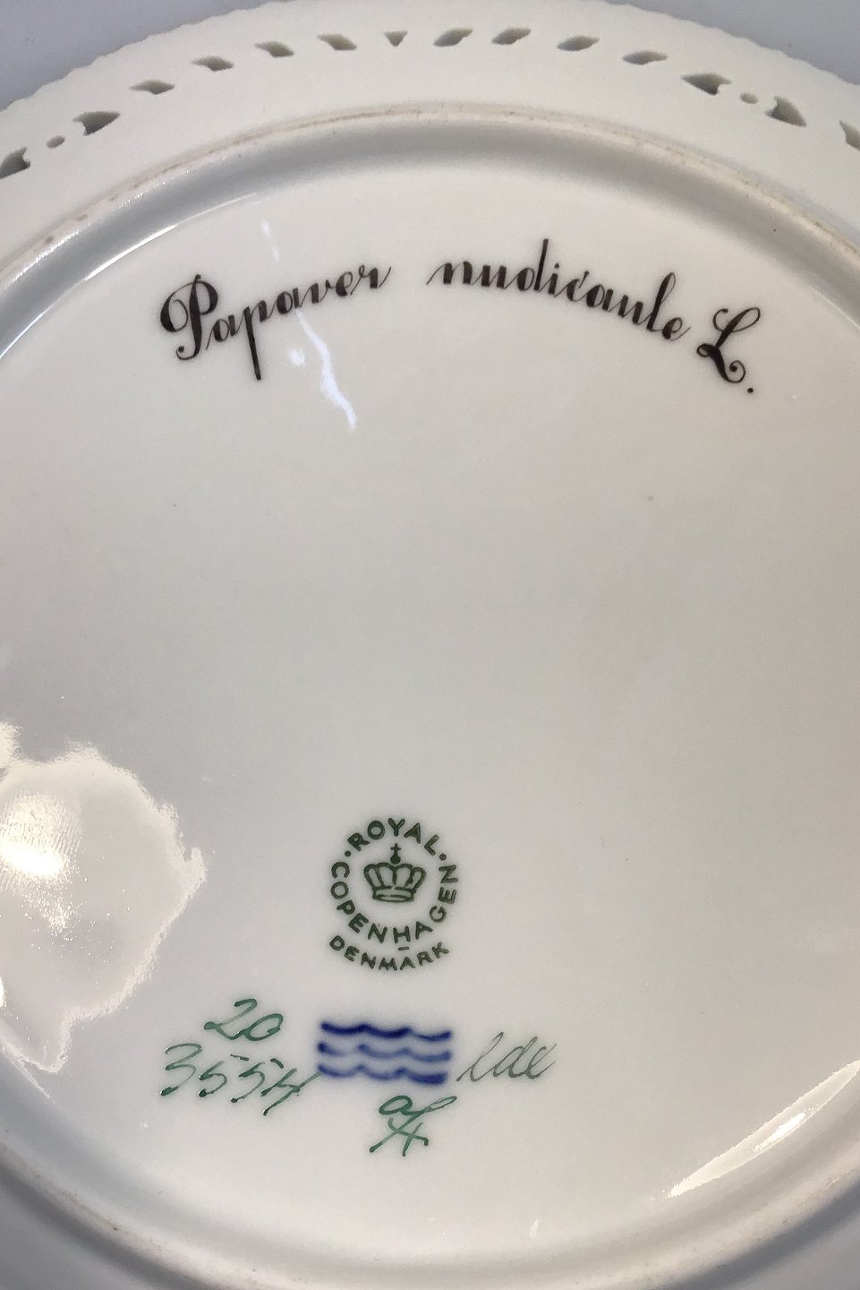 Royal Copenhagen Flora Danica Frokosttallerken No 20/3554 med gennembrudt kant. Latinsk Navn: Papaver nudicaule L (Islandsk valmue). Måler 23 cm. 1. Sort. I perfekt Stand
