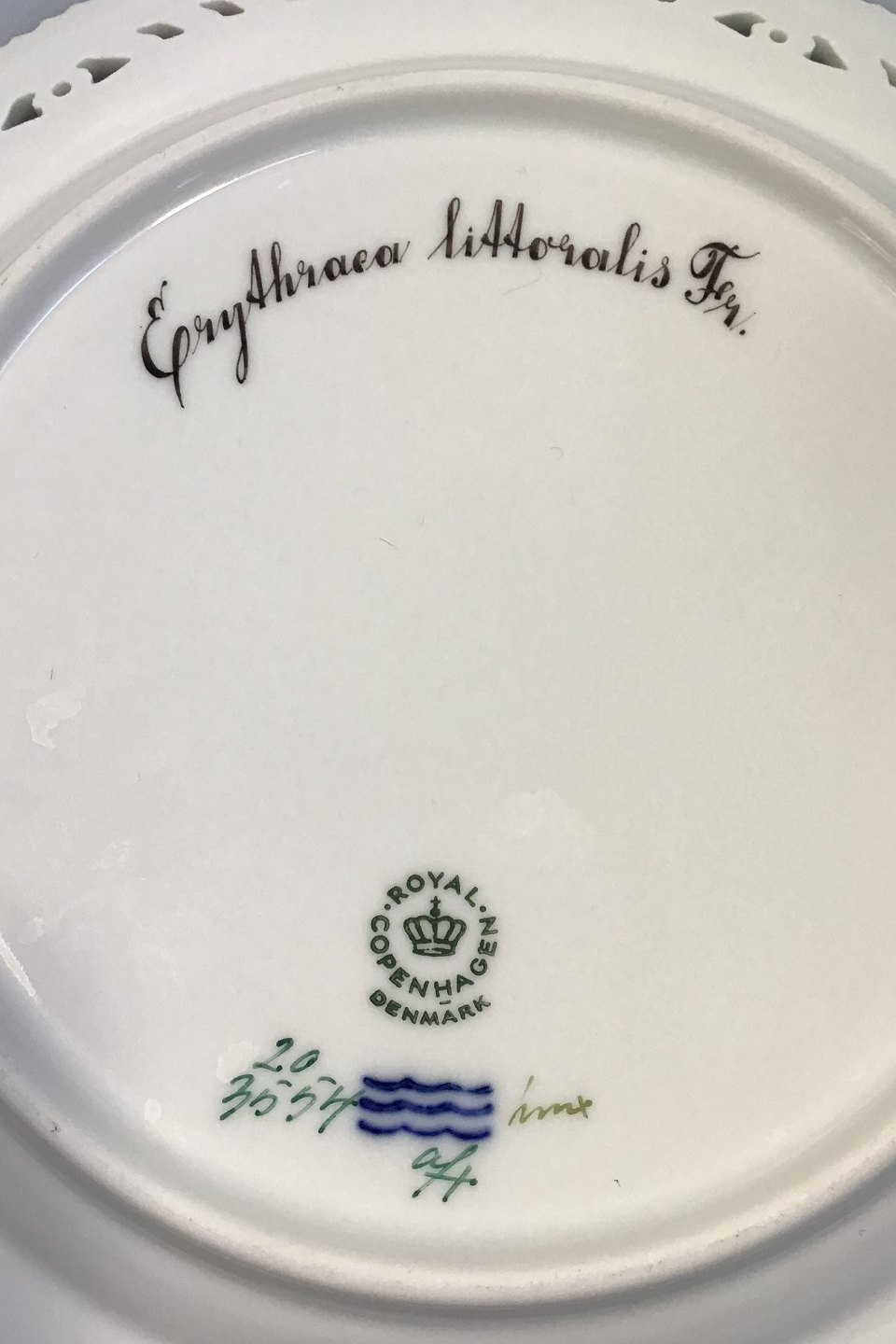Royal Copenhagen Flora Danica Frokosttallerken No 20/3554 med gennembrudt kant.