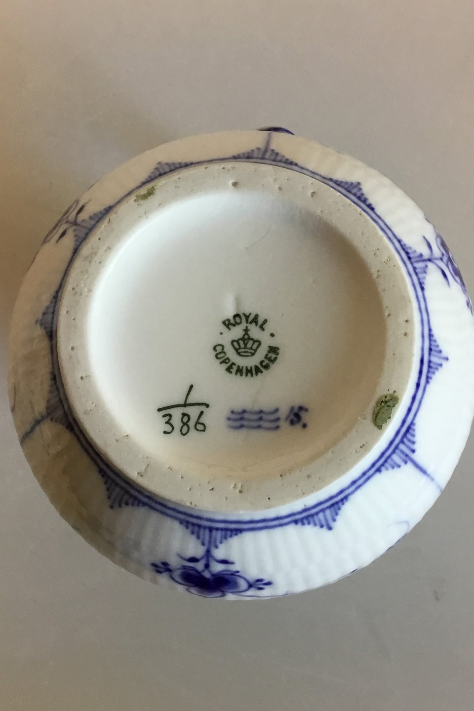 Royal Copenhagen Musselmalet Riflet Kande No 386. Måler 14,5 cm