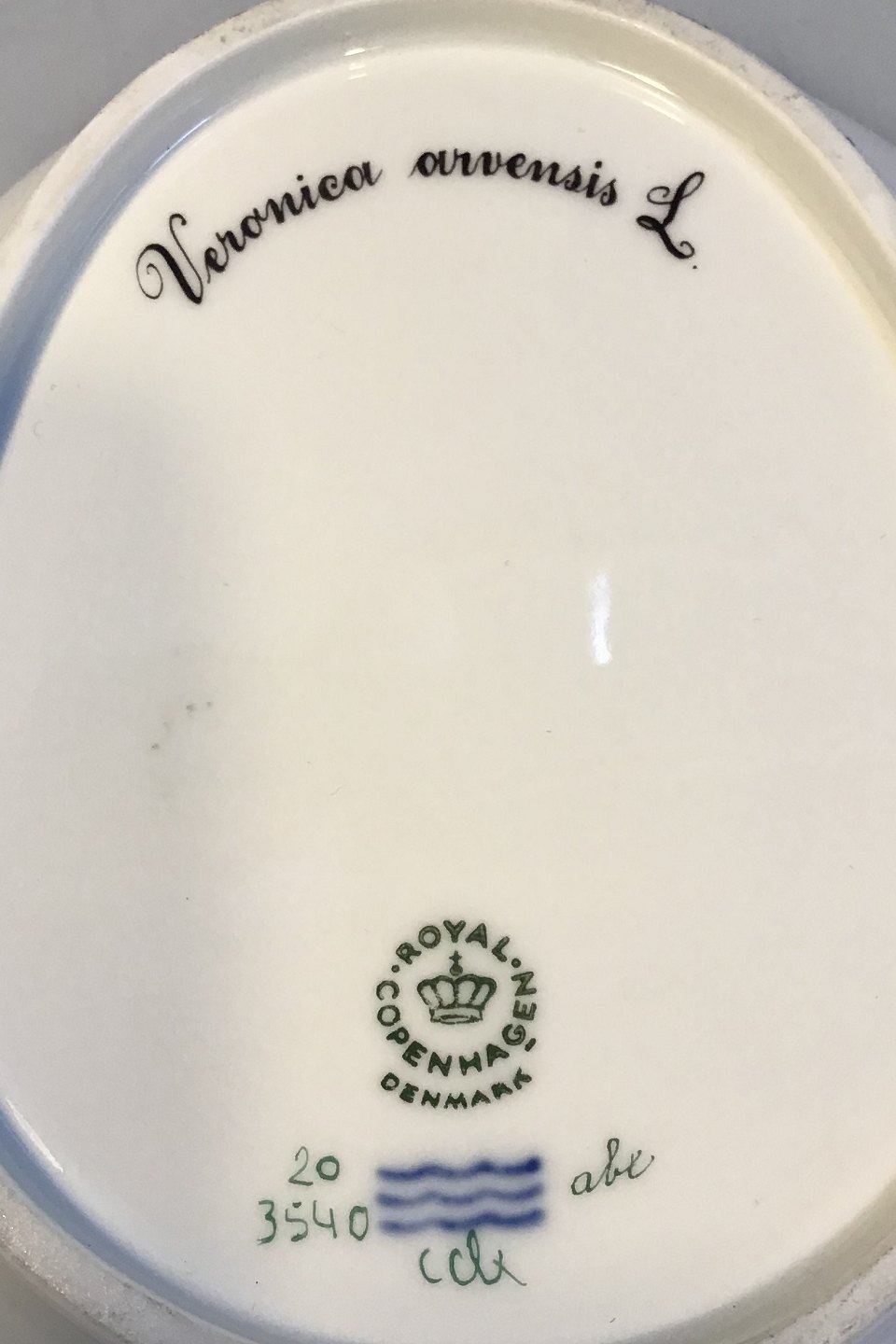 Royal Copenhagen Flora Danica Oval Assiette No20/3540 Latinsk Navn: Veronica avensis L (Mark-ærenpris) Måler 22,5 cm x 17 cm