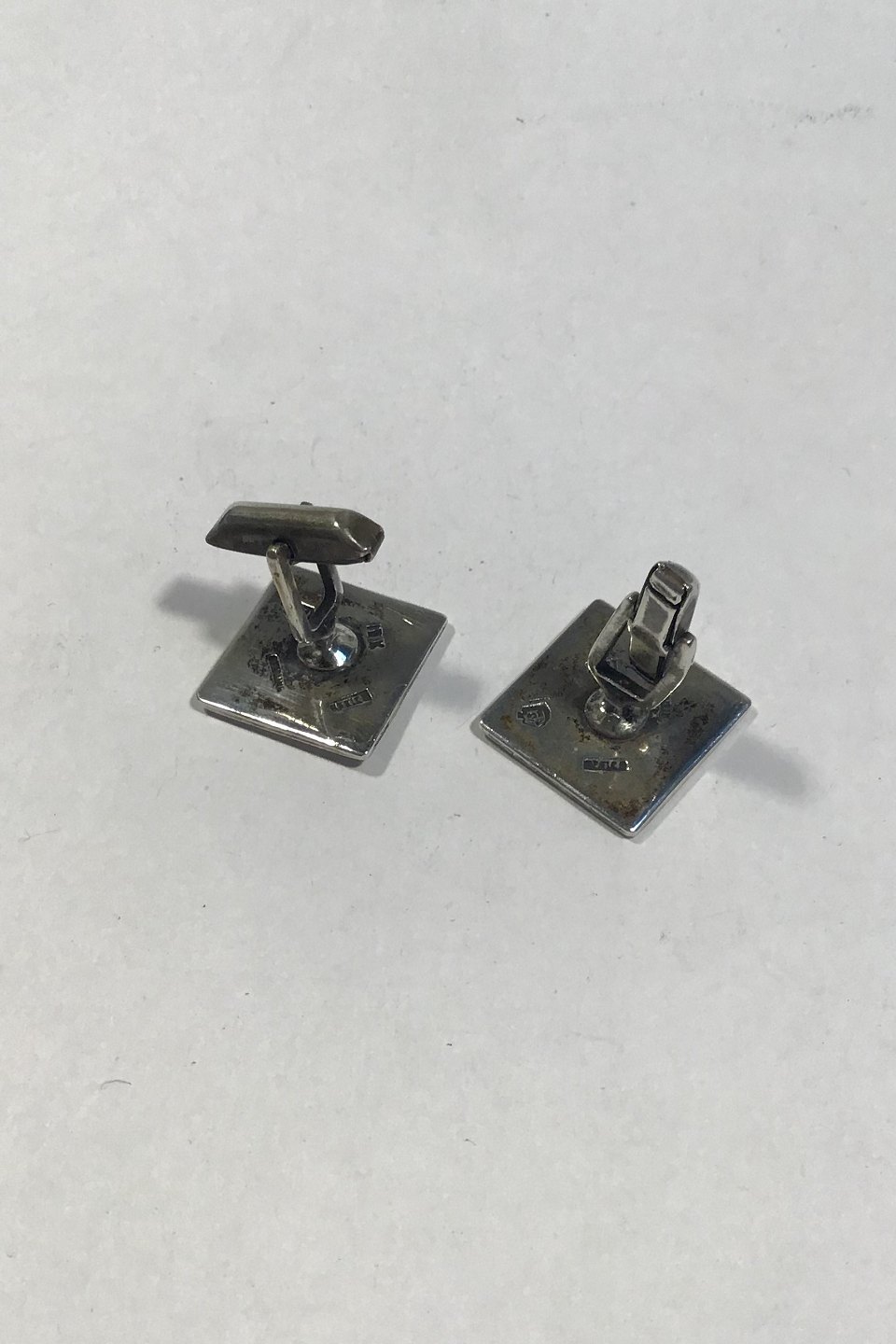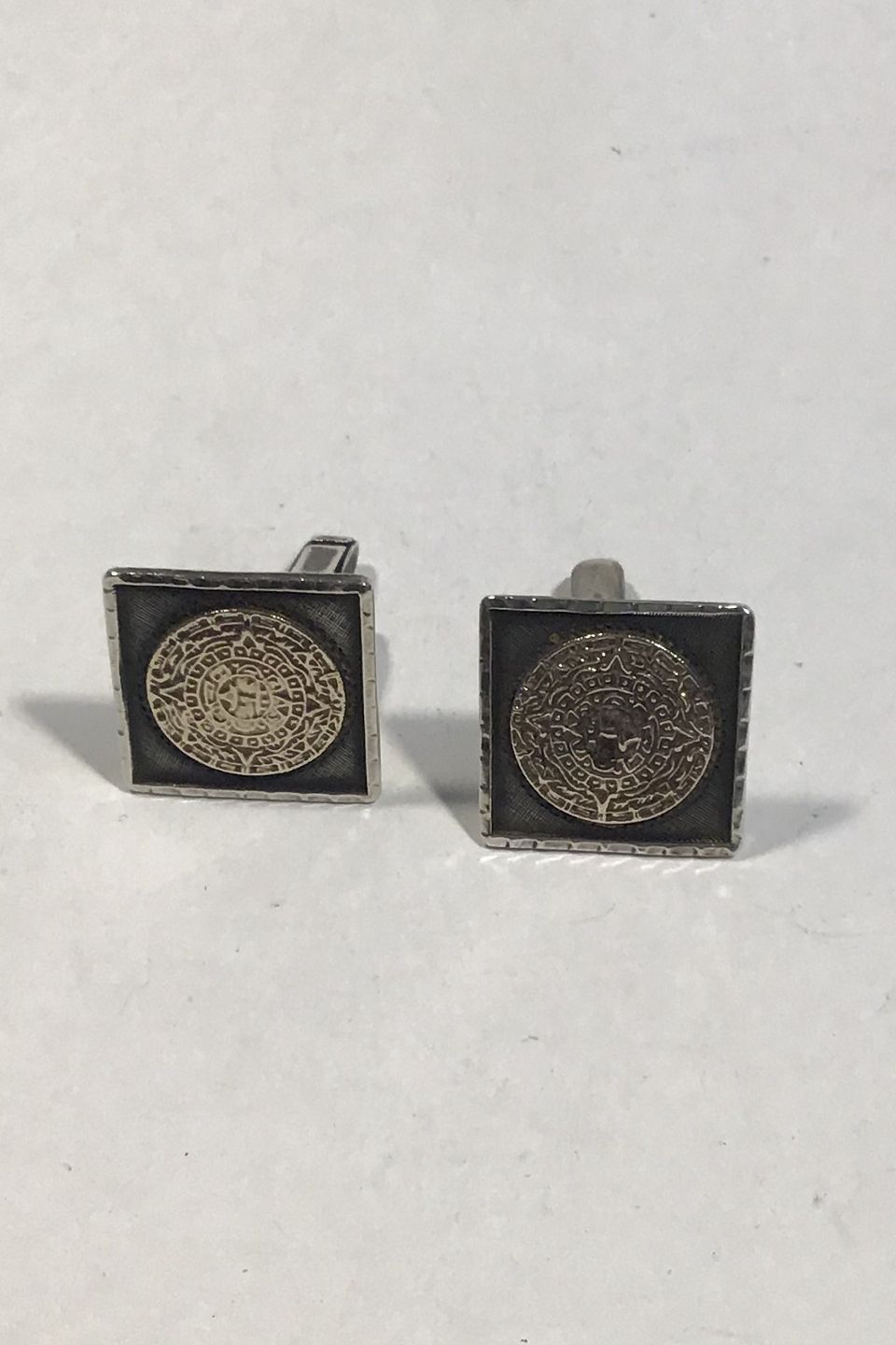 Mexico Sterling Silver/Gold Cuff Links Aztec-motif Measures 2 cm x 2 cm(0.78 in x 0.78 in) Weight combined 16.1 gr/0.56 oz
