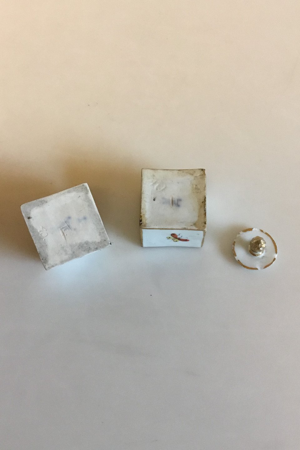 Meissen Salt og Peber sæt i porcelæn med dekoration med Høns og forskellige insekter. Måler 3 cm x 3 cm. Enkelte afslag