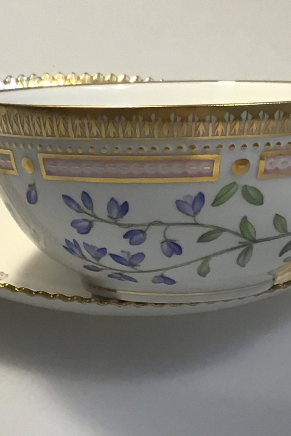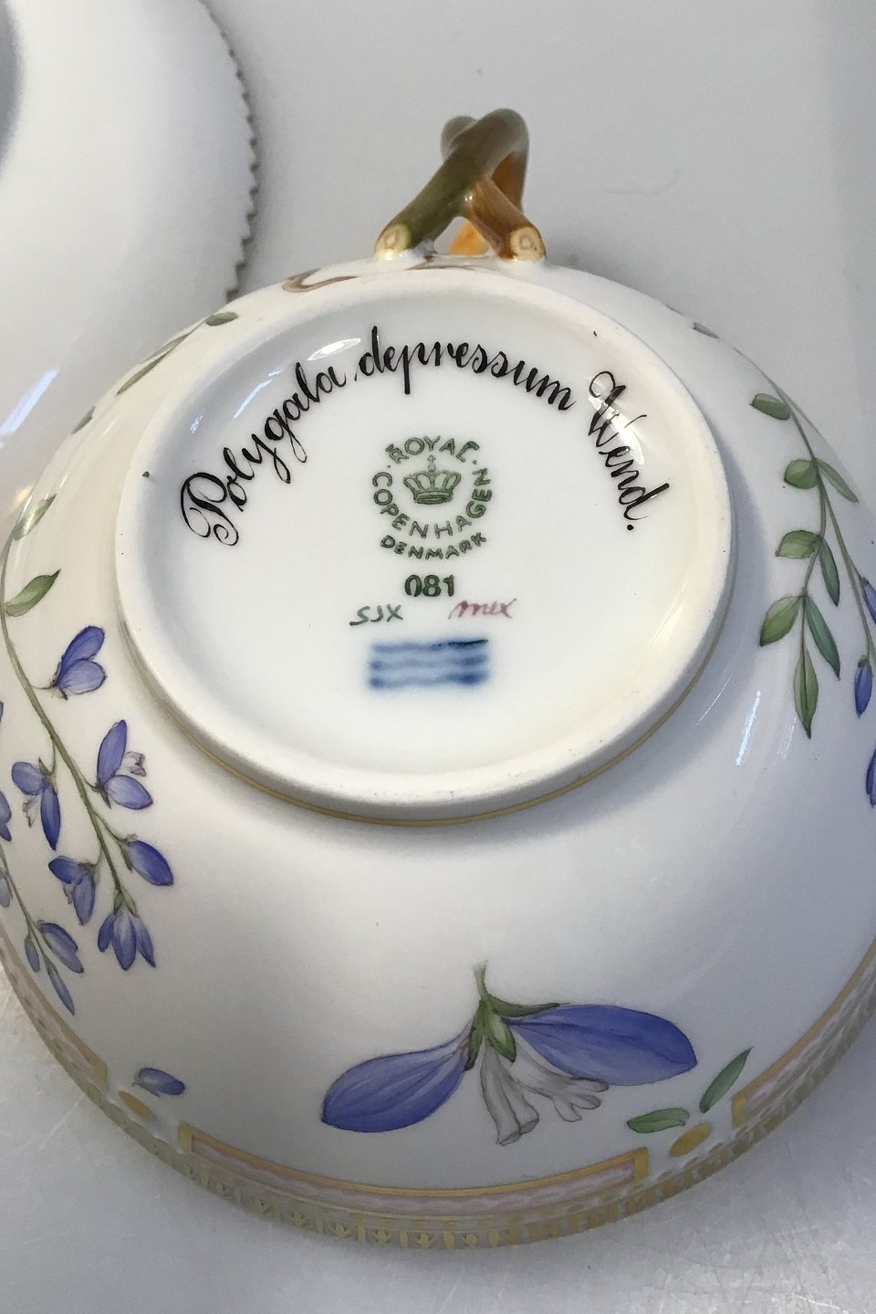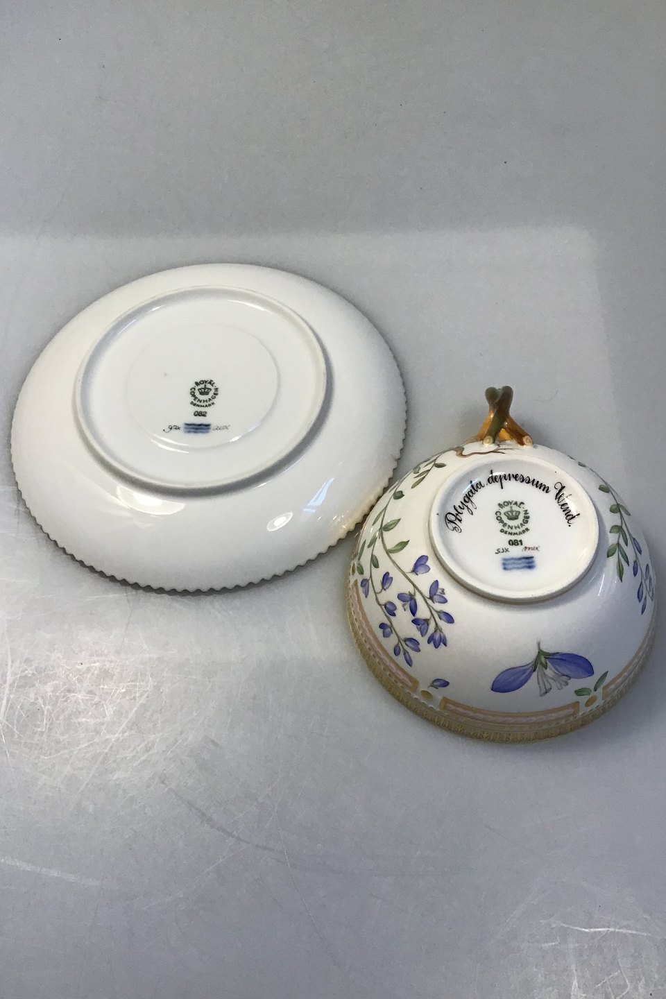 Royal Copenhagen Flora Danica Te kop/underkop No 081+082 Latinsk Navn Polygala depressum Wend( Mælkeurt) Diam kop 10.8 cm underkop 15.5 cm