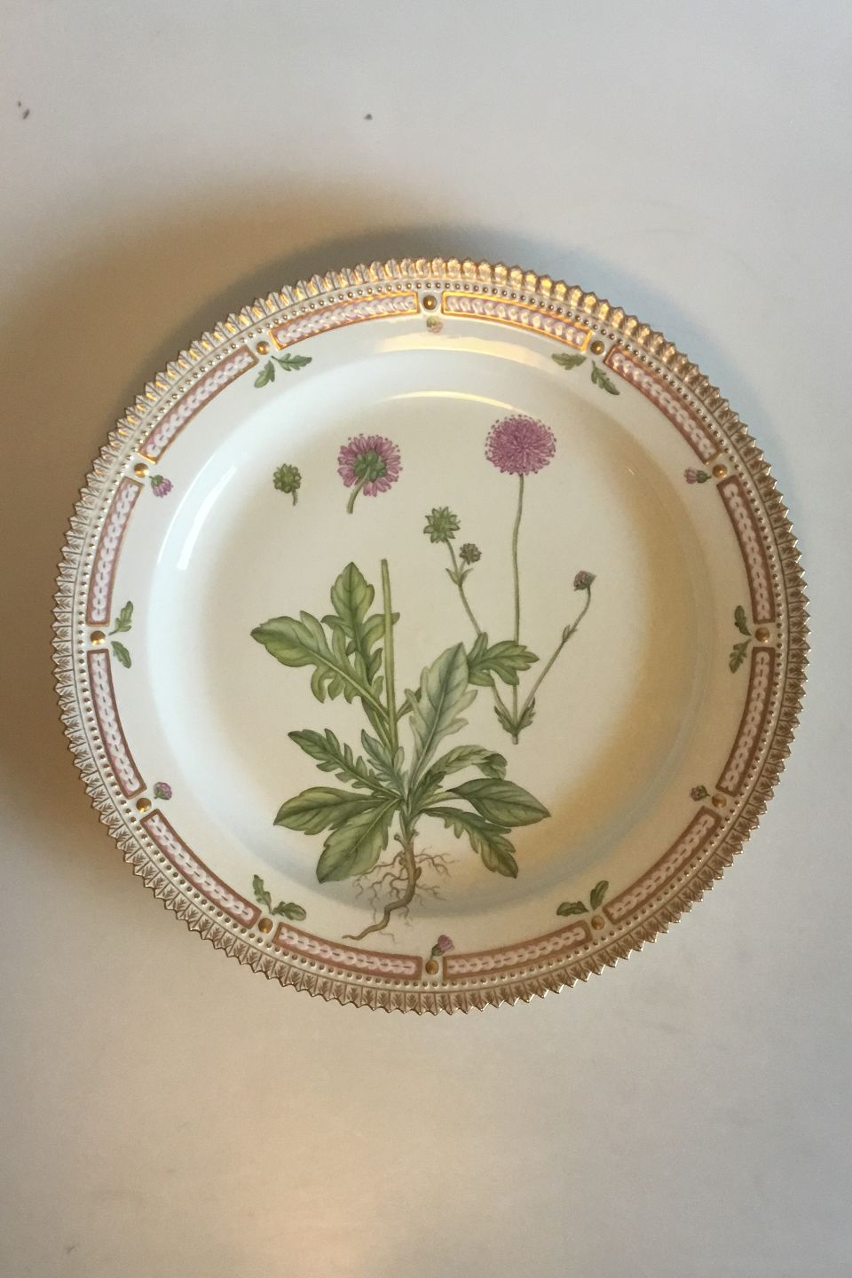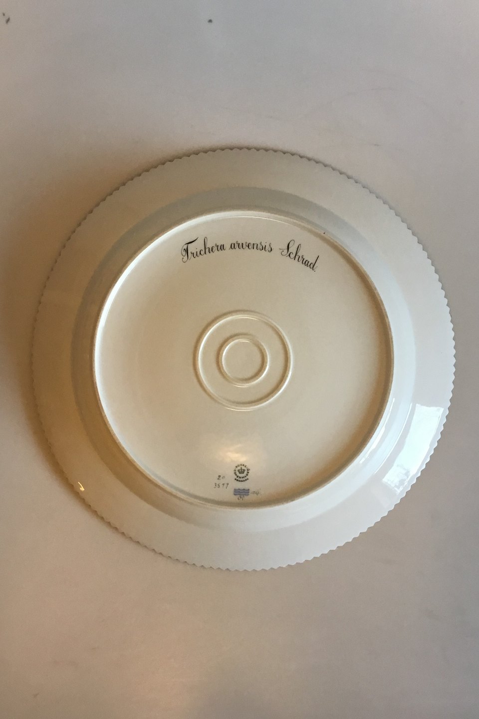Royal Copenhagen Flora Danica Stort Rundt Servingsfad No 20/3577. Latinsk tekst: Trichera arvensis Scrad. Måler 38,5 cm