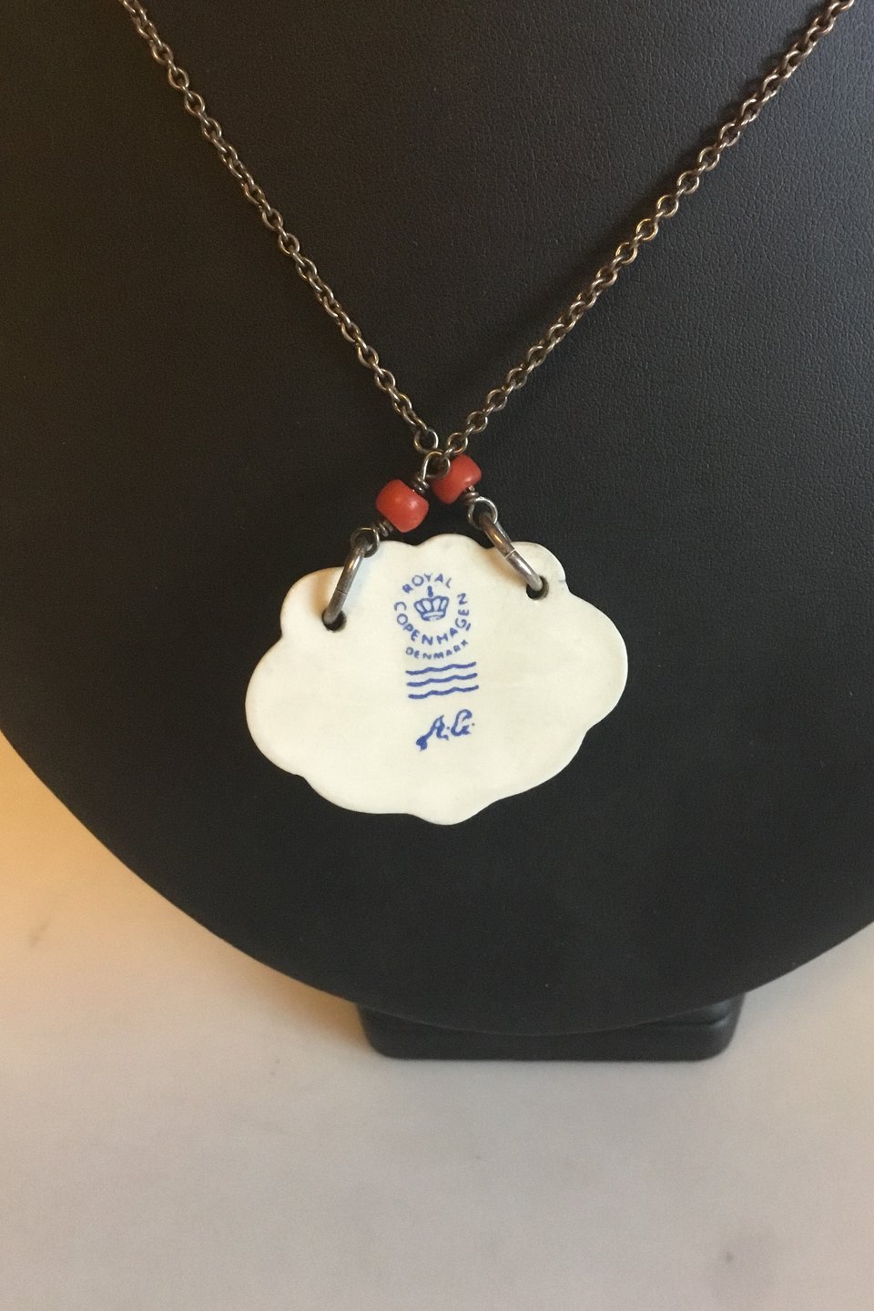 Royal Copenhagen Vedhæng af porcelæn designet af Arje Griegst. Sterling sølv af Anton Michelsen. Måler 4,4 cm x 3,2 cm. Kæden er 45 cm