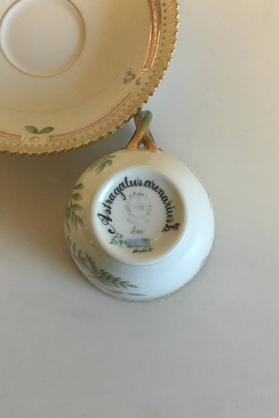 Royal Copenhagen Flora Danica Kaffekop og Underkop No 20/3597. Latinsk Navn: Astragalus arenarius L. Måler Kop: 7 cm x 7,5 cm dia. Underkop: 13,8 cm