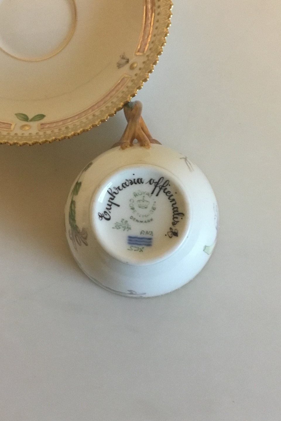 Royal Copenhagen Flora Danica Coffee Cup and Saucer No 20/3597. Latin Name: Eupharasia officinalis L. Measures Cup: 7 cm / 2 3/4 in. x 7.5 cm / 2 61/64 in. dia. Saucer: 13.8 cm / 5 7/16 in.