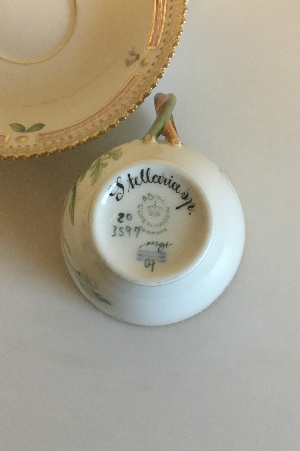 Royal Copenhagen Flora Danica Kaffekop og Underkop No 20/3597. Latinsk Navn: Stellaria sp. Måler Kop: 7 cm x 7,5 cm dia. Underkop: 13,8 cm