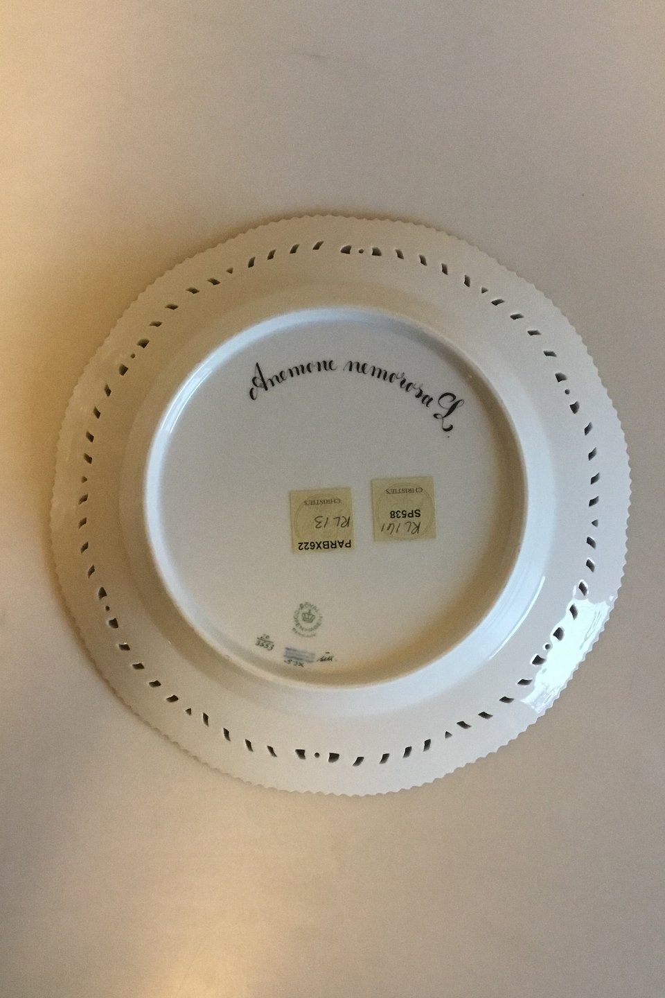 Royal Copenhagen Flora Danica Plate with pierced border No 20/3553. Latin name: Anemona nemorosa L. Måler 25.5 cm / 10 3/64 in.