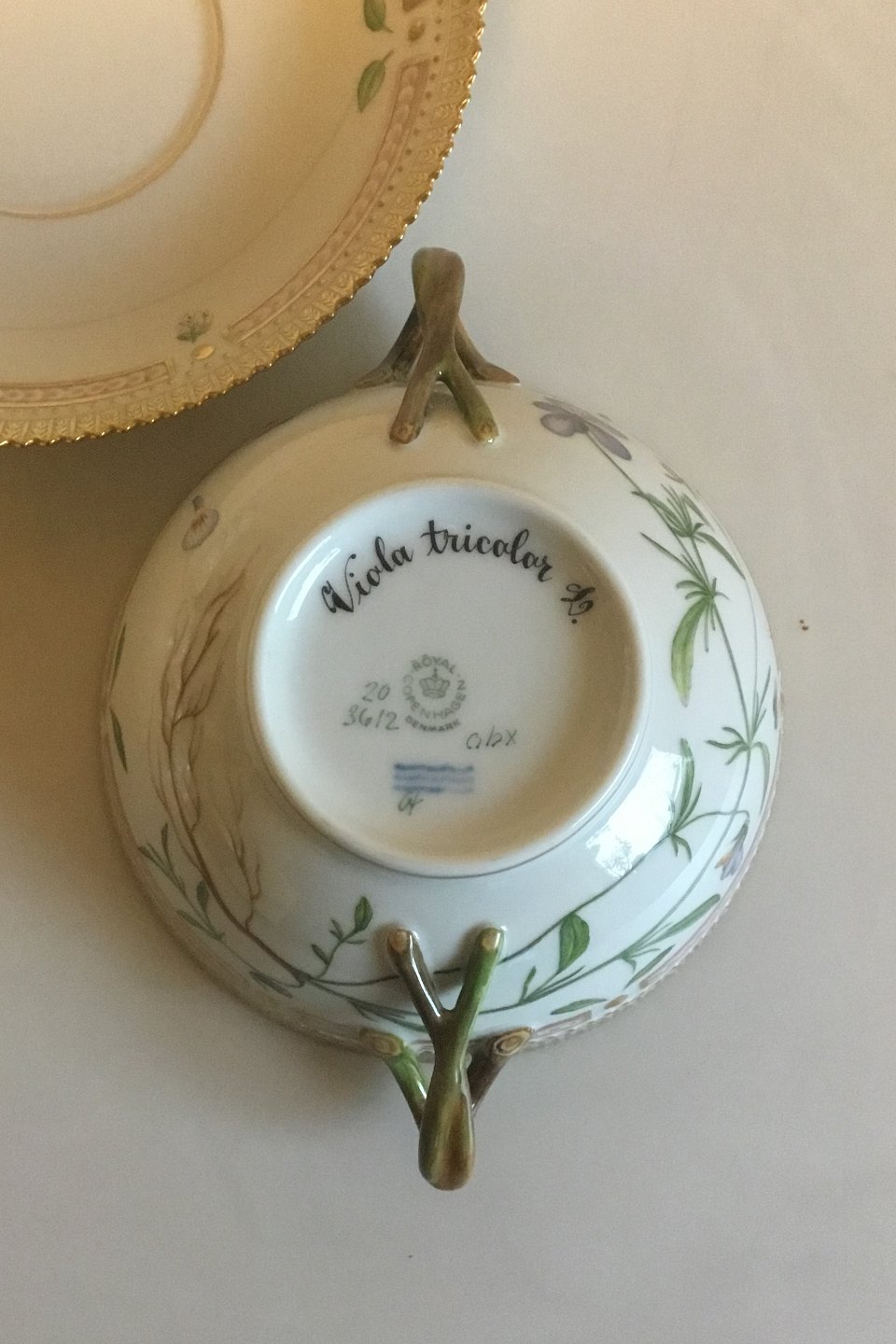 Royal Copenhagen Flora Danica Bouillon Cup with saucer No 20/3612 Latin Name Viloa tricolor L. Holds 40 cl / 13 1/2 oz.