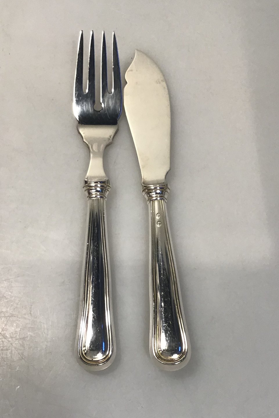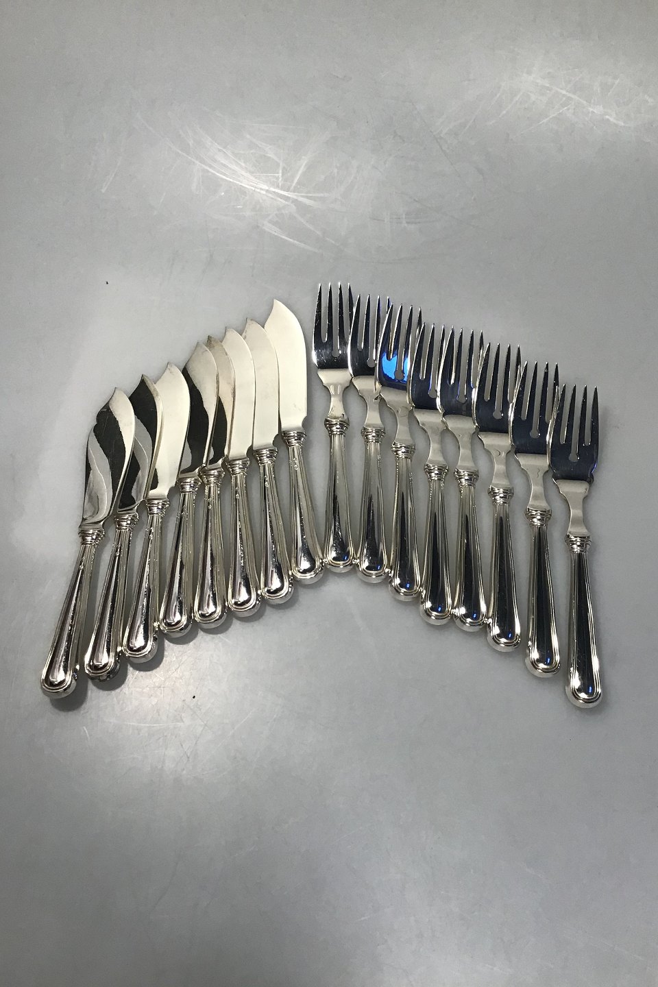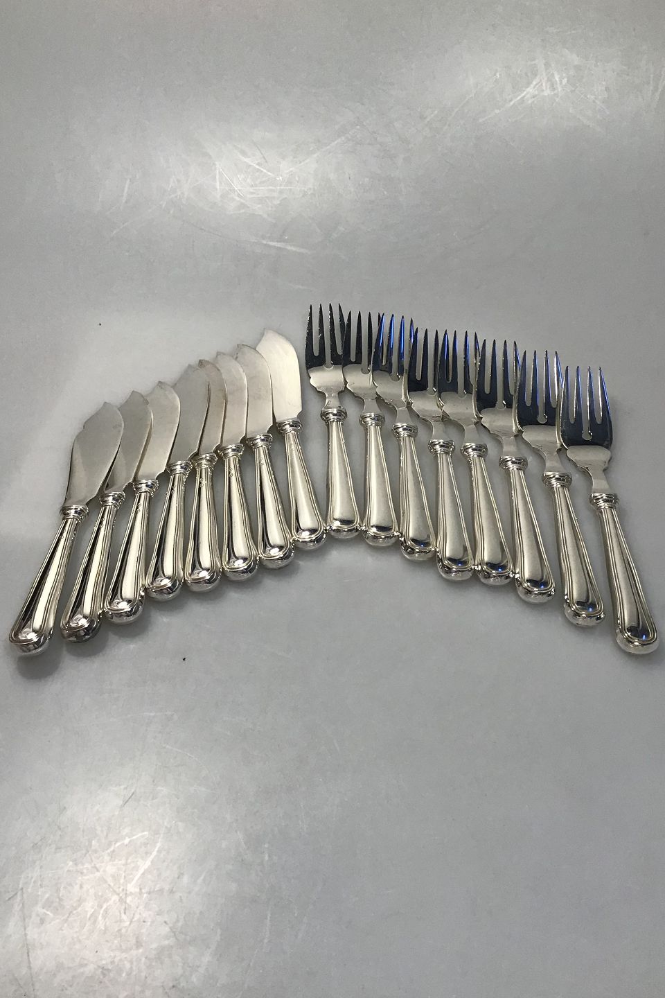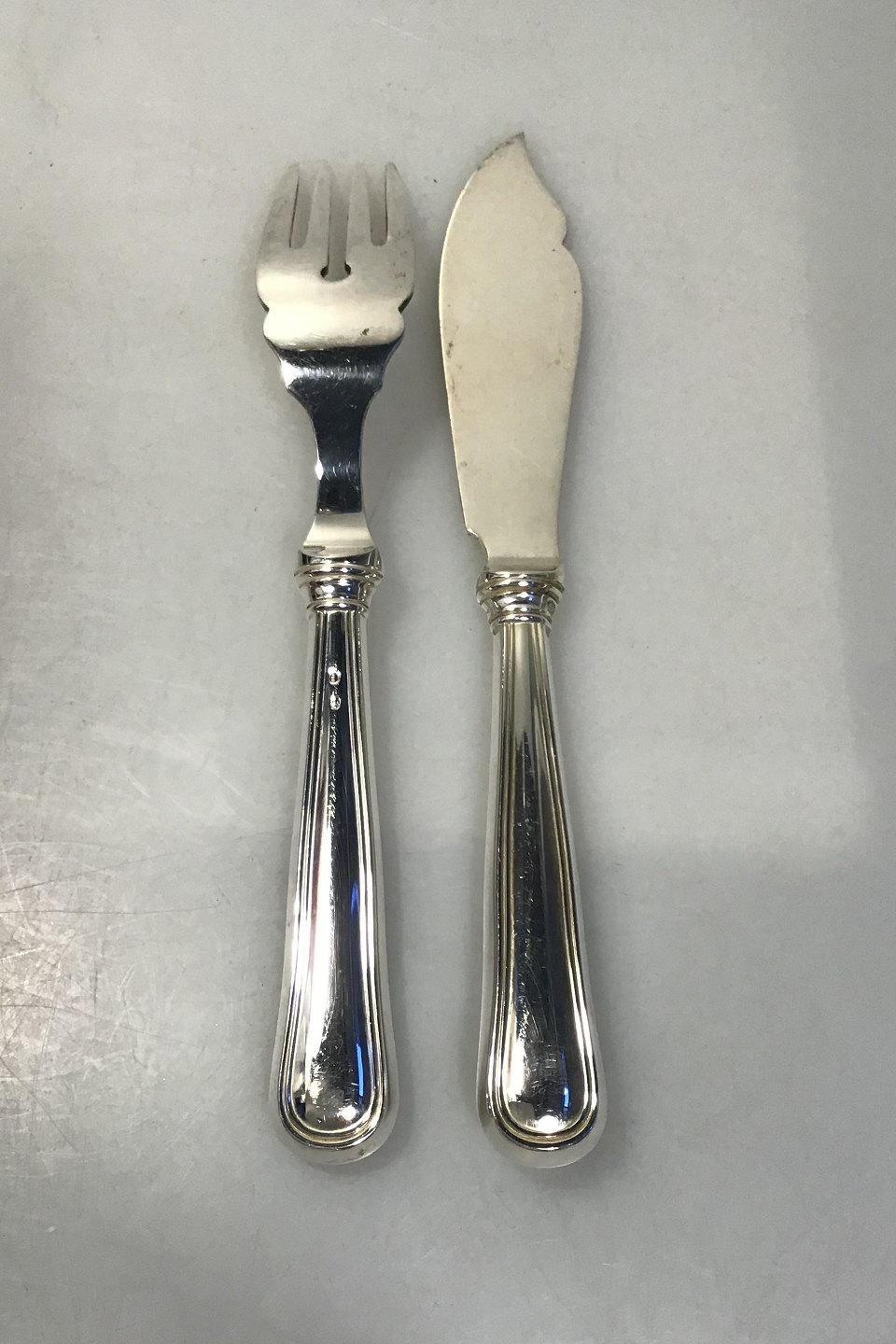 W&S Sørensen Sølv Dobbeltriflet Fiskebestik 8 peroner(16 dele) Helsølv Måler Kniv 19 cm Gaffel 18.5 cm