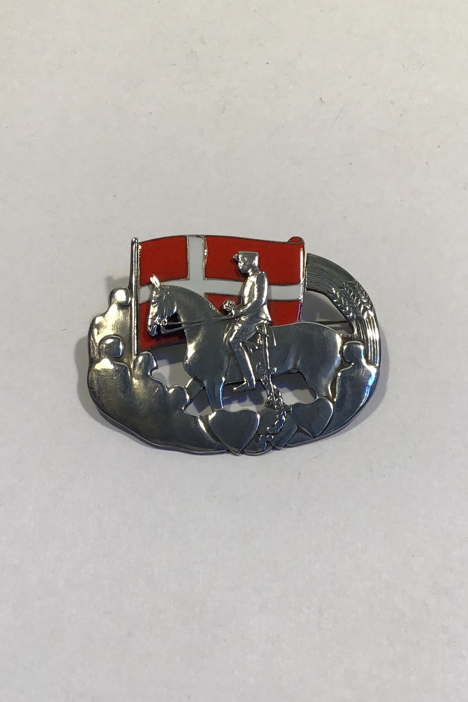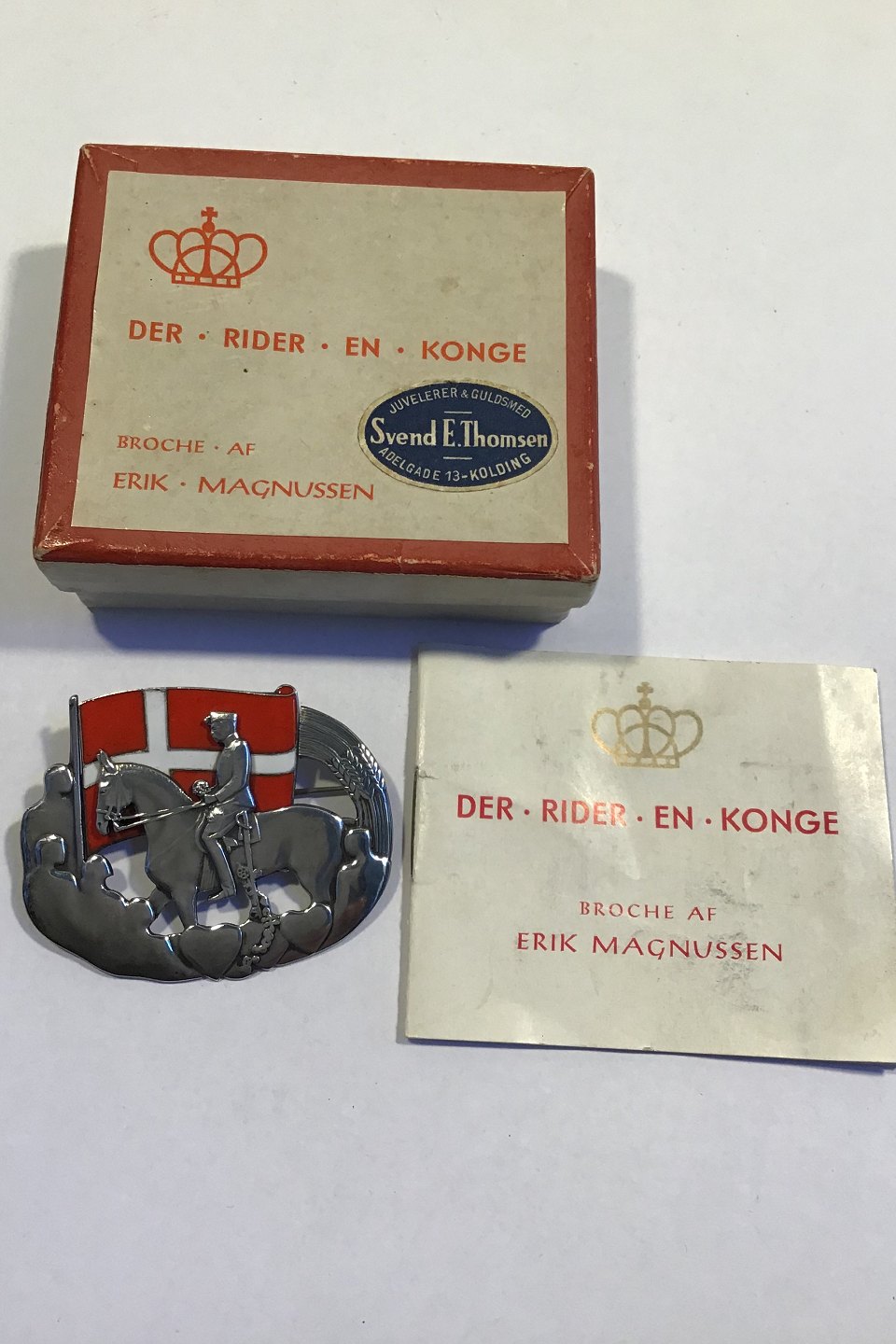 Erik Magnussen Sølv Brochemedalje "Der rider en konge" Måler 4 cm x 5 cm Vægt 23.1 gr (lille emaljeafslag/Gravering)Original Æske og papirer