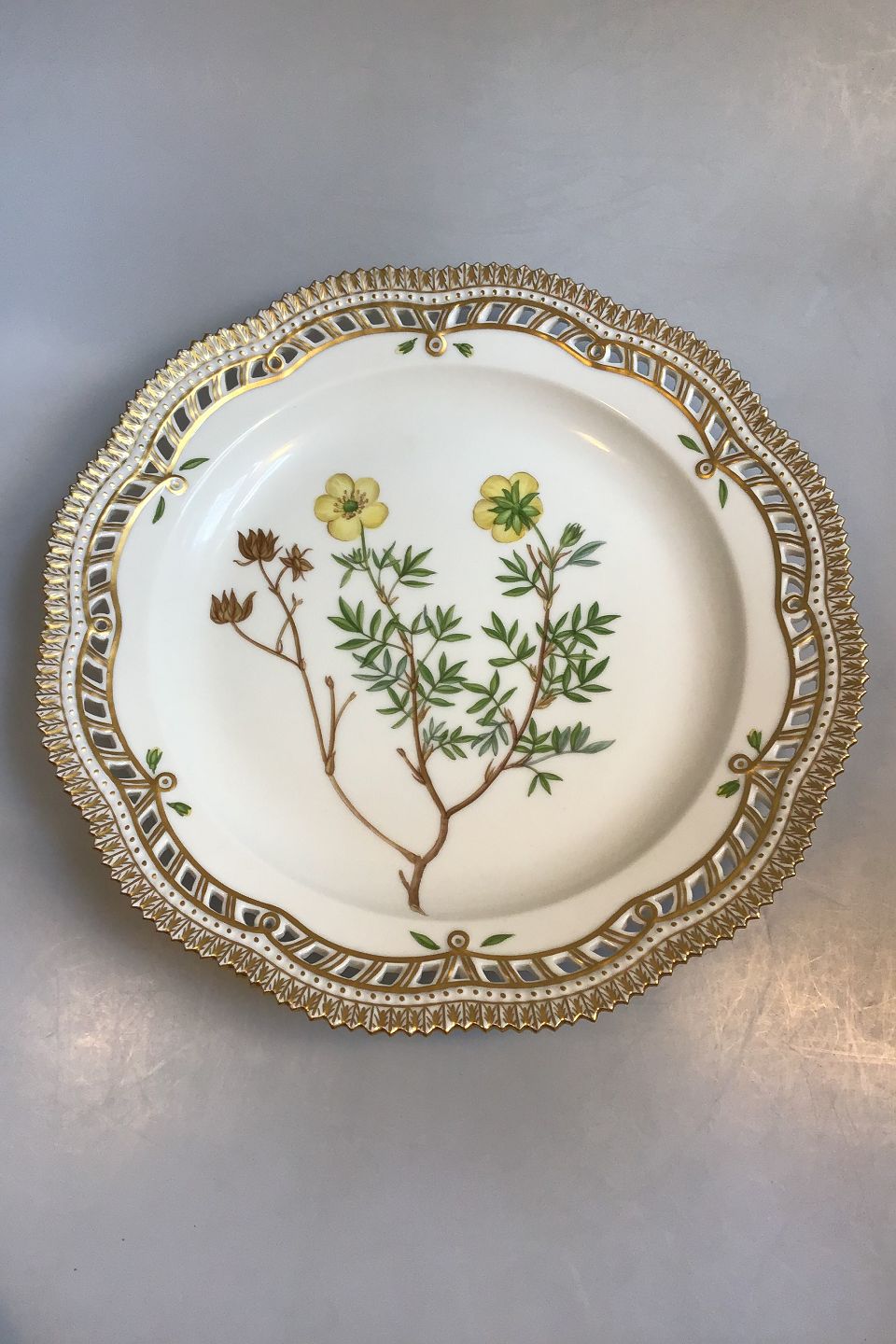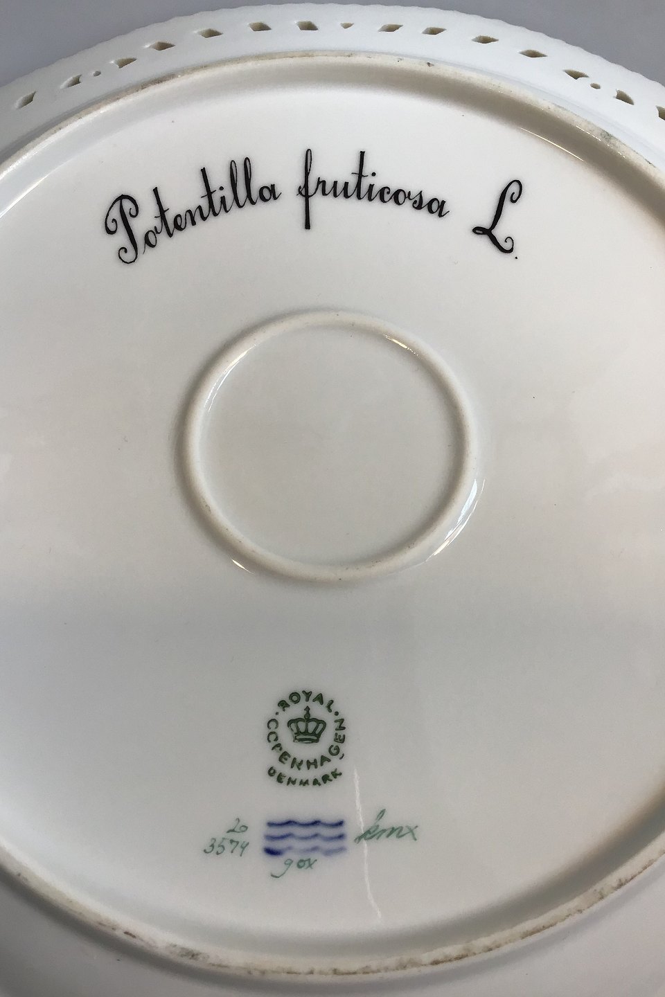 Royal Copenhagen Flora Danica Fad med gennembrudt kant No 20/3574. Latinsk navn: "Potentilla fruticosa L."Måler 28 cm. 1. Sortering.