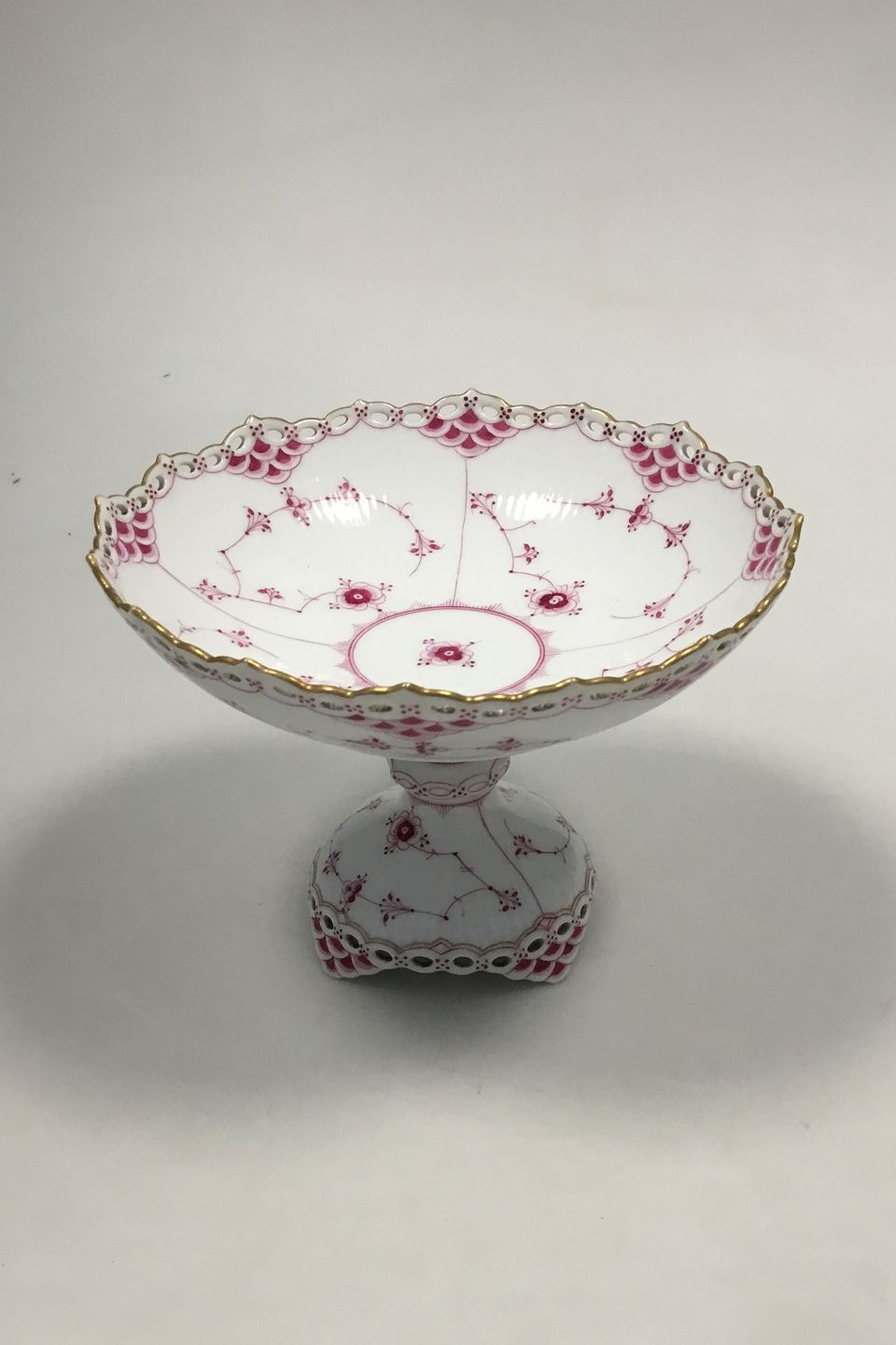 Royal Copenhagen Blue Fluted Red Ruby/Pink with Gold Edge Full Lace Cake Stand No 2/1020. Måler 14.5 cm / 5 45/64 in.