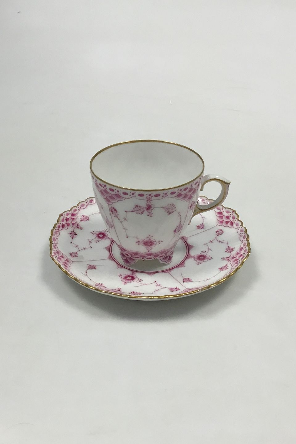 Royal Copenhagen Musselmalet Purpur med guldkant Helblonde Mokkakop med underkop. Måler Kop: 6,1 cm x 6,4 cm dia. Underkop: 12,5 cm
