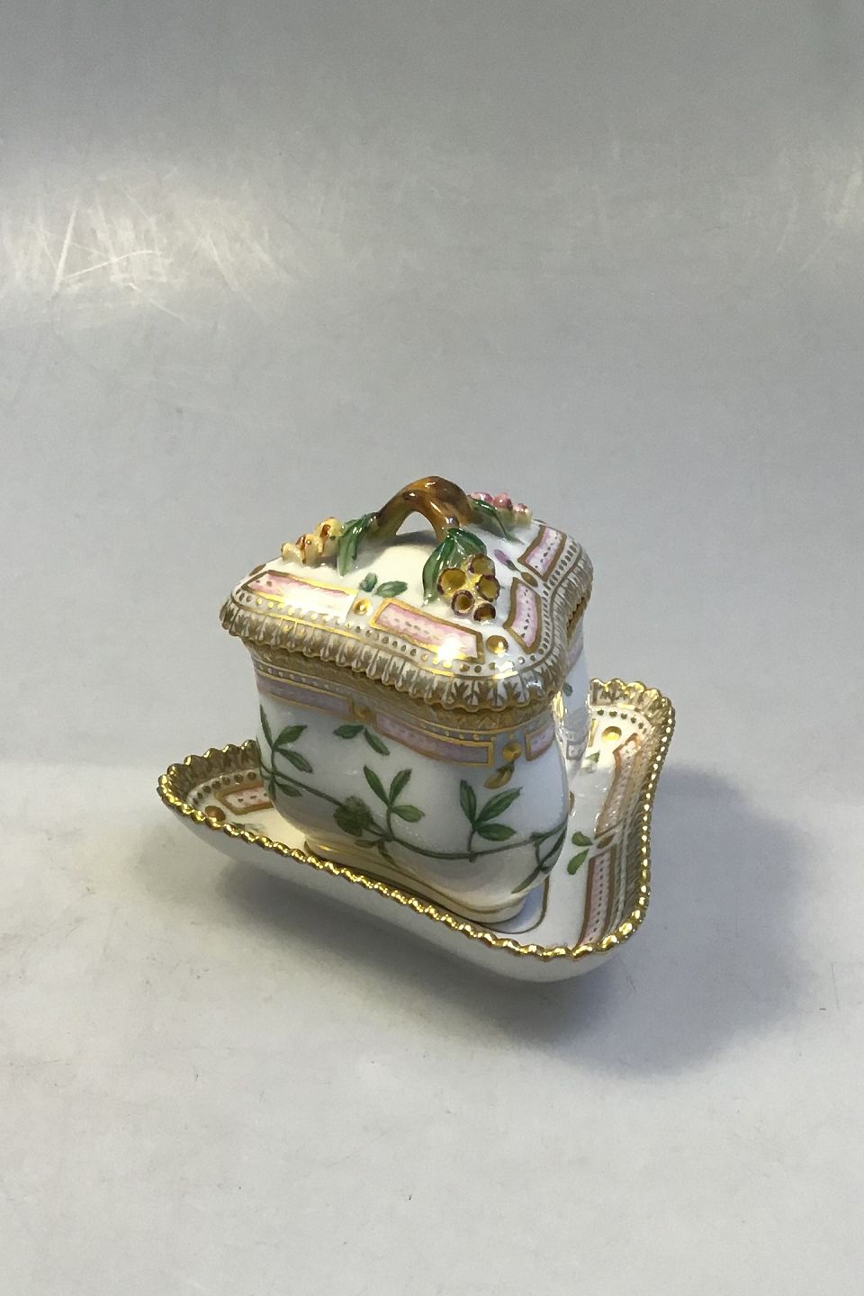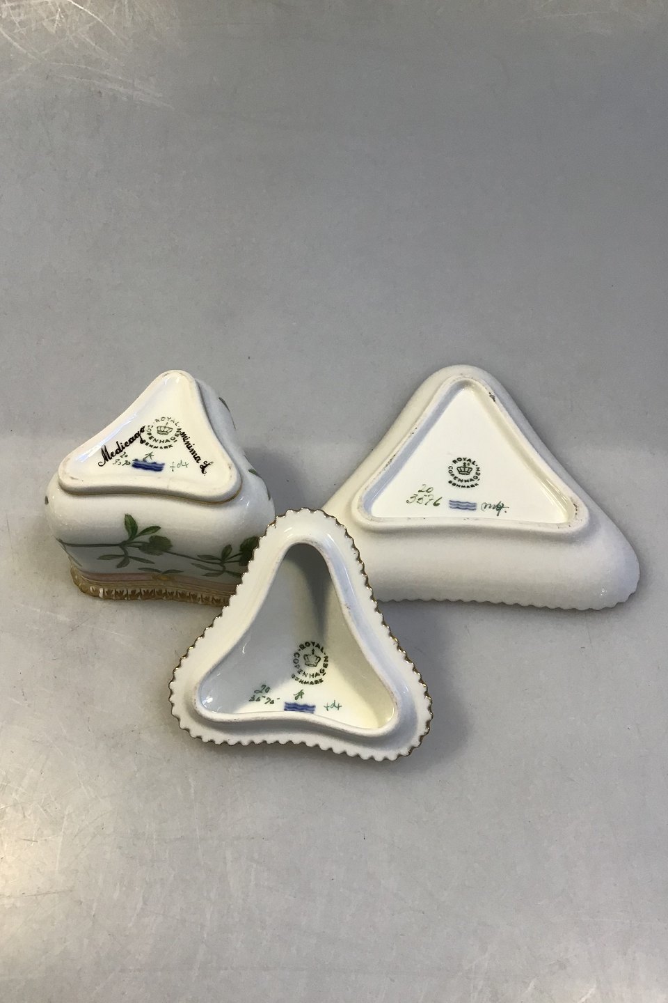 Royal Copenhagen Flora Danica 20/3575 + 20/3576 Triangular Custard Cup Latin Name: Medicago minima L. Measures H 9 cm Diam 10 cm