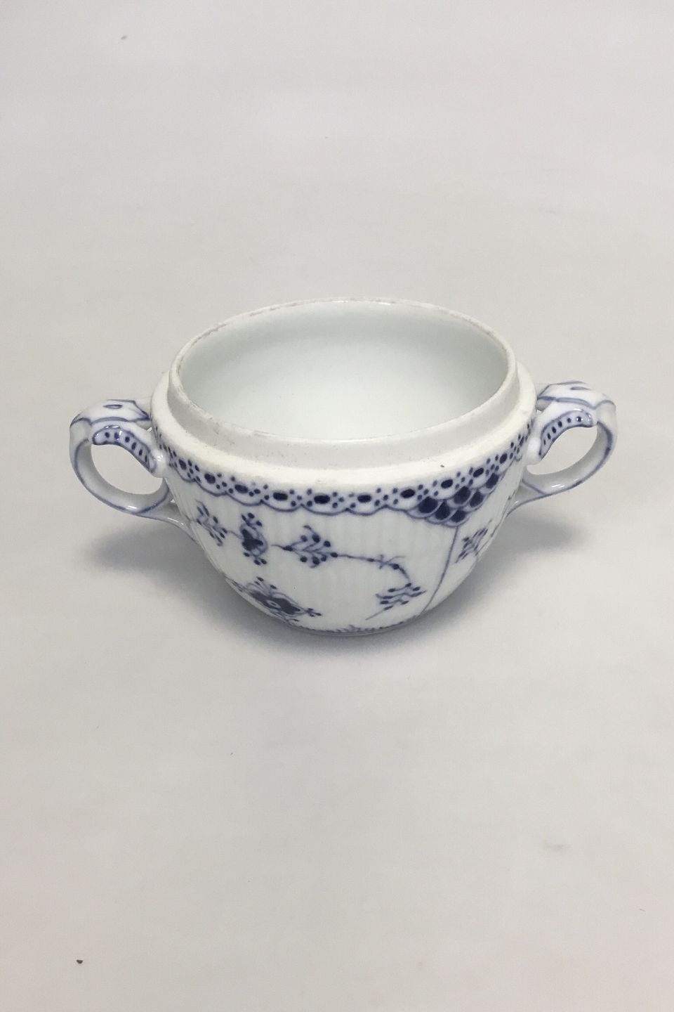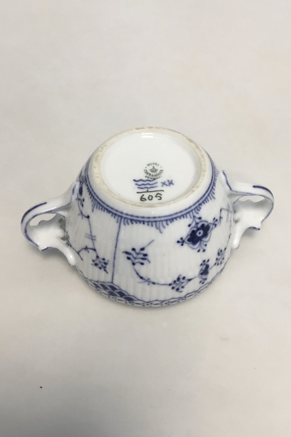 Royal Copenhagen Blue Fluted Half Lace Sugar Bowl No 605. Measures 7 cm / 2 3/4 in. x 10 cm / 3 15/16 in. This sugar Bowl is sold without lid.