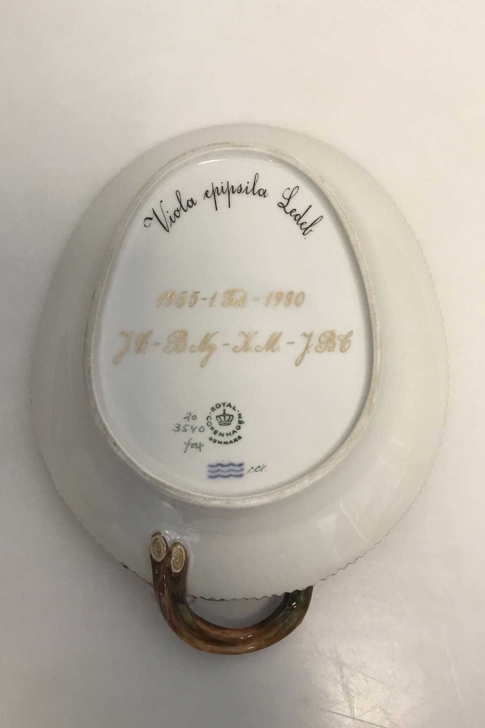 Royal Copenhagen Flora Danica Oval Assiette No 20/3540 Latinsk Navn: "Viola epipsila Ledeb.". Med tekst i guld til modtager på bagsiden, se billede. Måler 22,5 cm x 17 cm