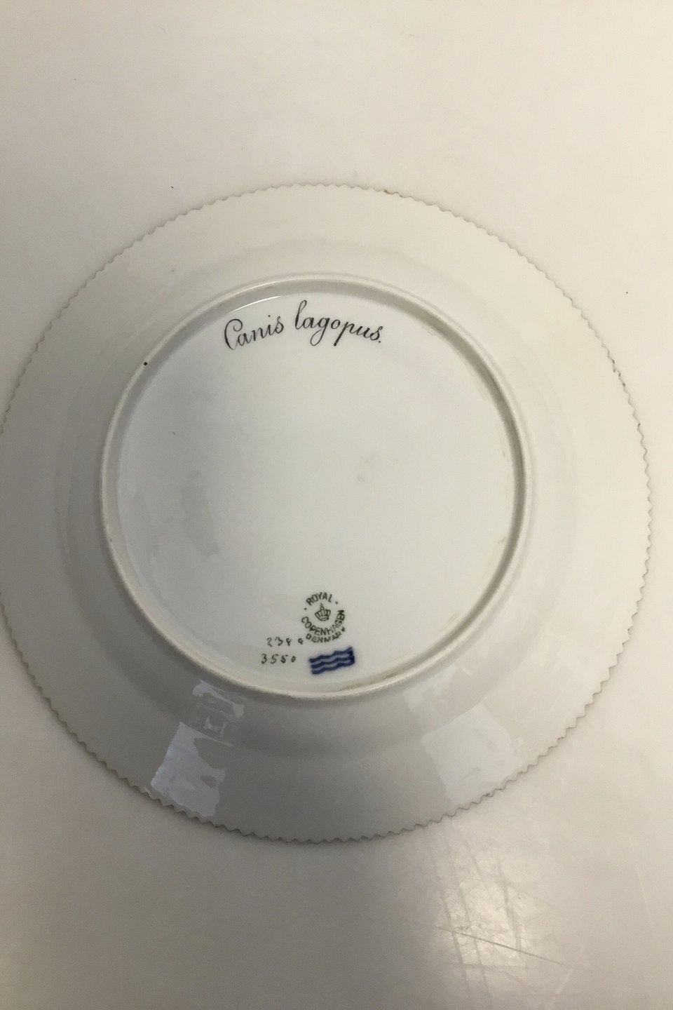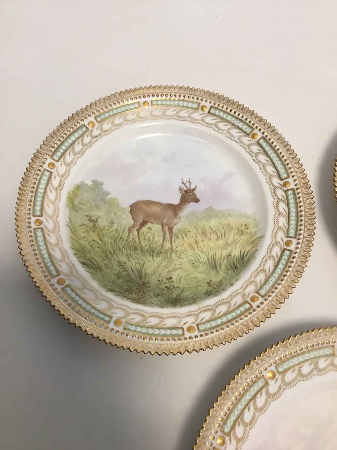Royal Copenhagen Flora Danica/Fauna Danica Game Luncheon Plates. Inner gold rim with feather design. No 239A/3550 (Set of 7) Measures 22 cm(8 21/32 in) Latin Names: Putorius erminea, Lepus timidus, Putorius furo, Canis lagopus, Cervus caprelus,Capelle rupicapra, Tarandus rangifer. Painter H Larsen