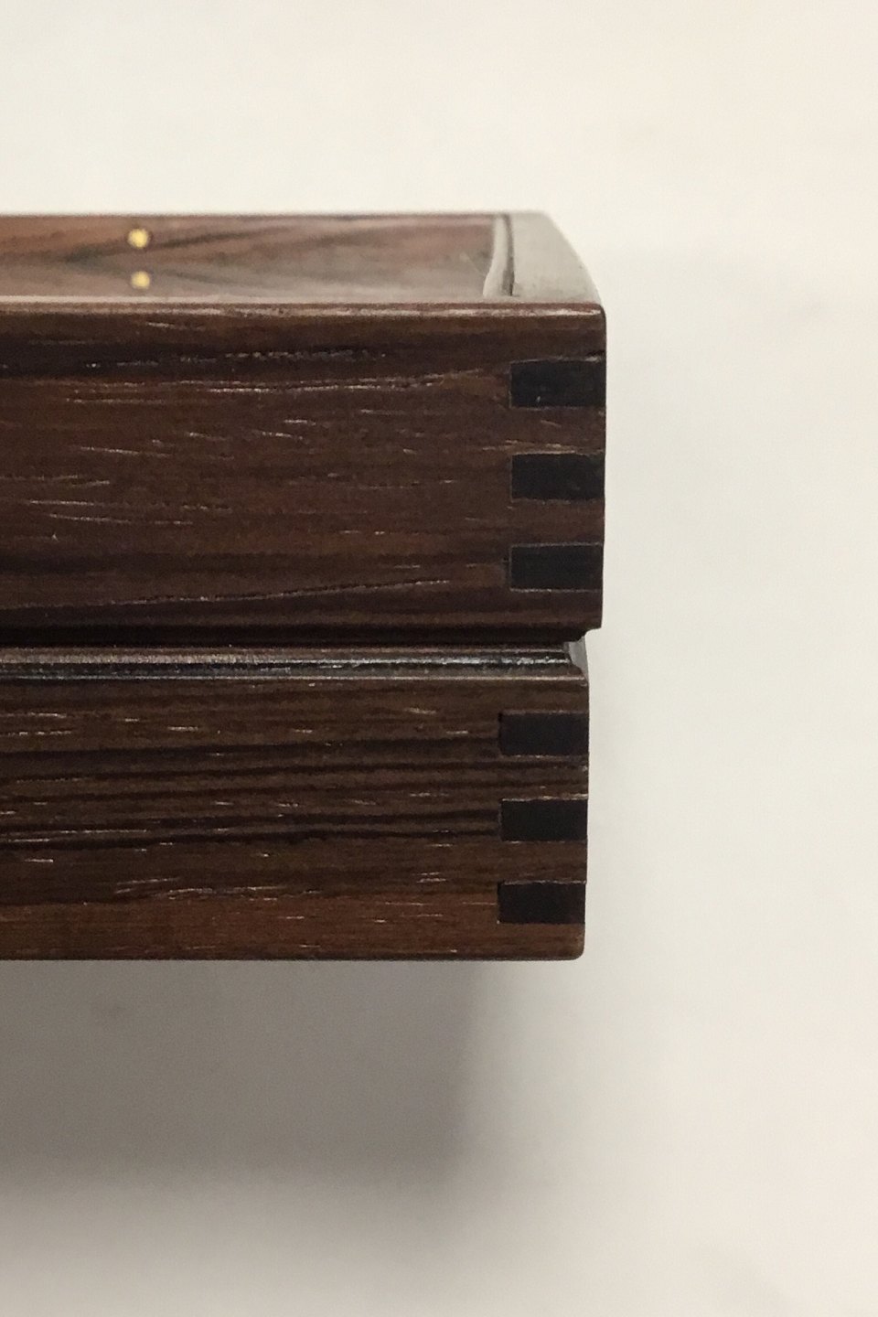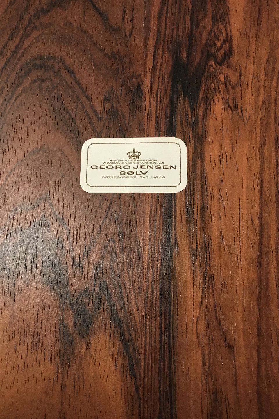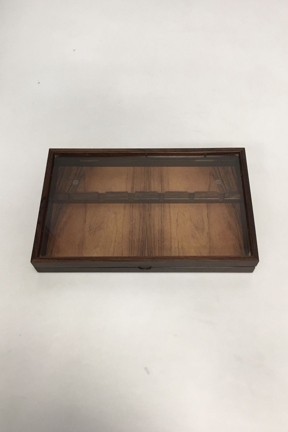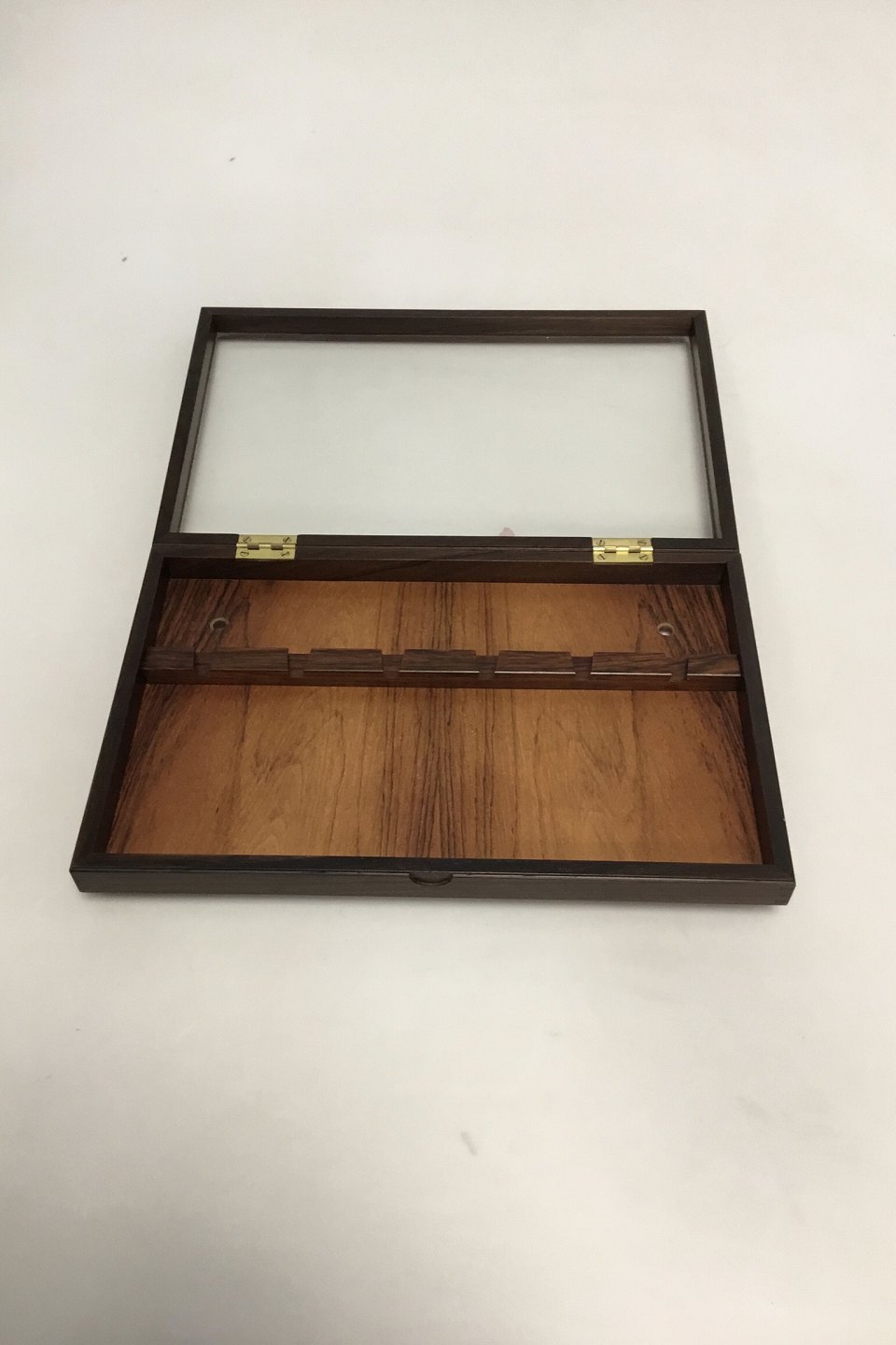 Georg Jensen Væg display kasse til skeer .Udført i Palisander. Låget isat glas. Samlingerne er tappet og lister påmonteret med messing skruer. L: 31,9 cm, H: 19,9 cm, D: 4,5 cm.