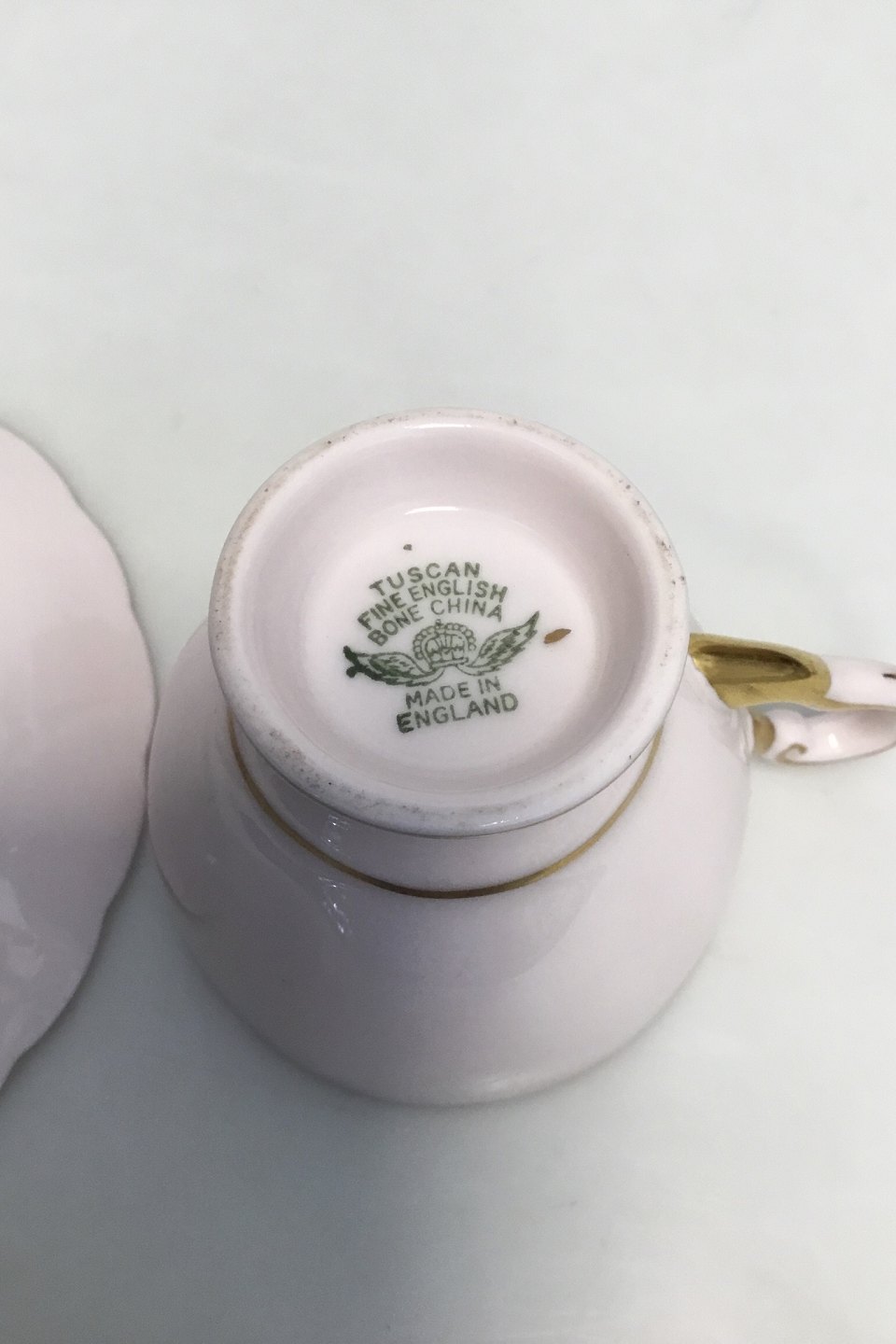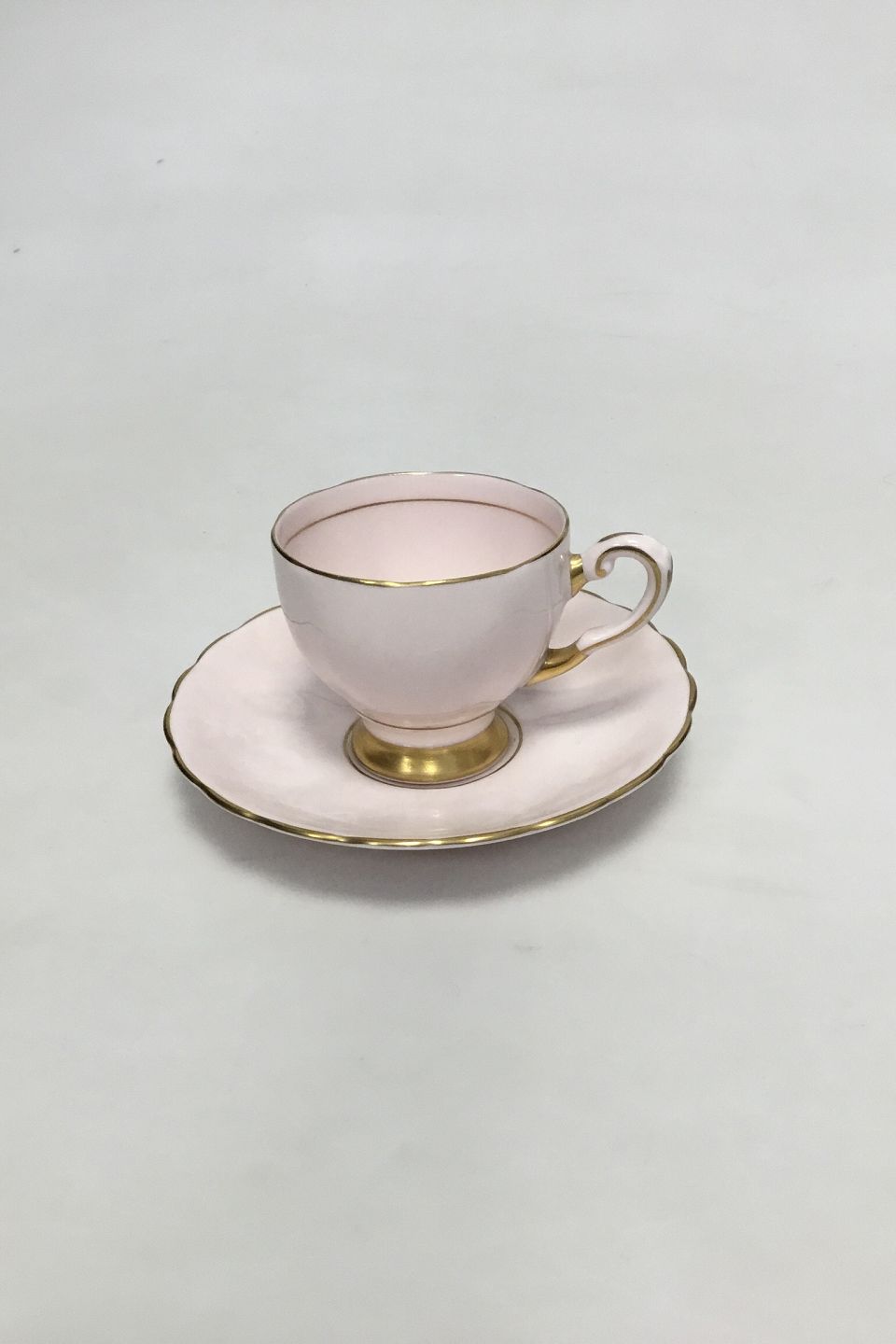 English, R H & S L Plant (Ltd) pink porcelain cup and saucer with gilt rim. Marked: "Tuscan Fine English Bone China, Made in England". H: 6 cm. (2 23/64").