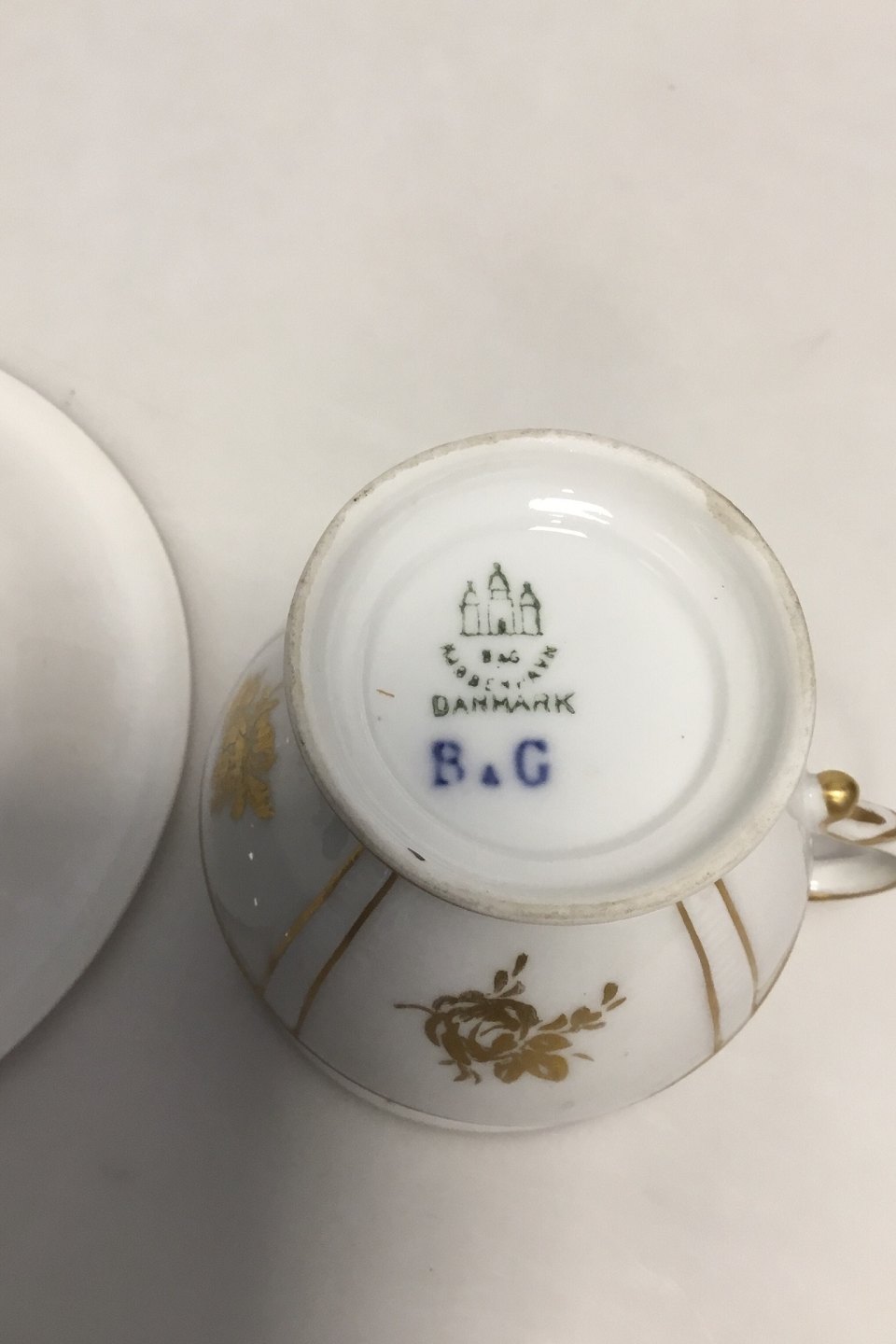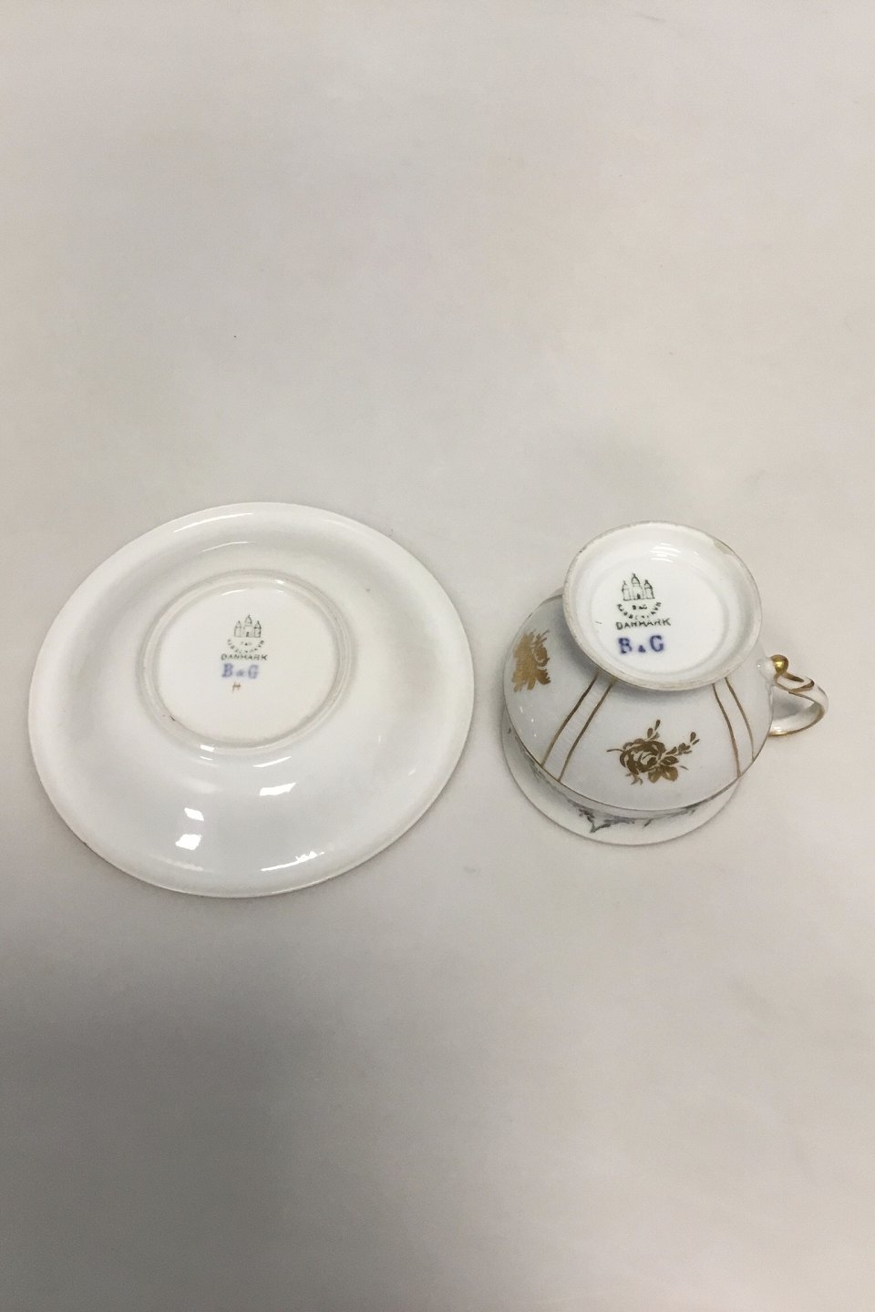 Bing & Grøndahl Cup and Saucer in gilt and Polychrome over glaze with floral motive. Under side both marked with blue B & G mark. H: 8,5 cm (3 11/32")