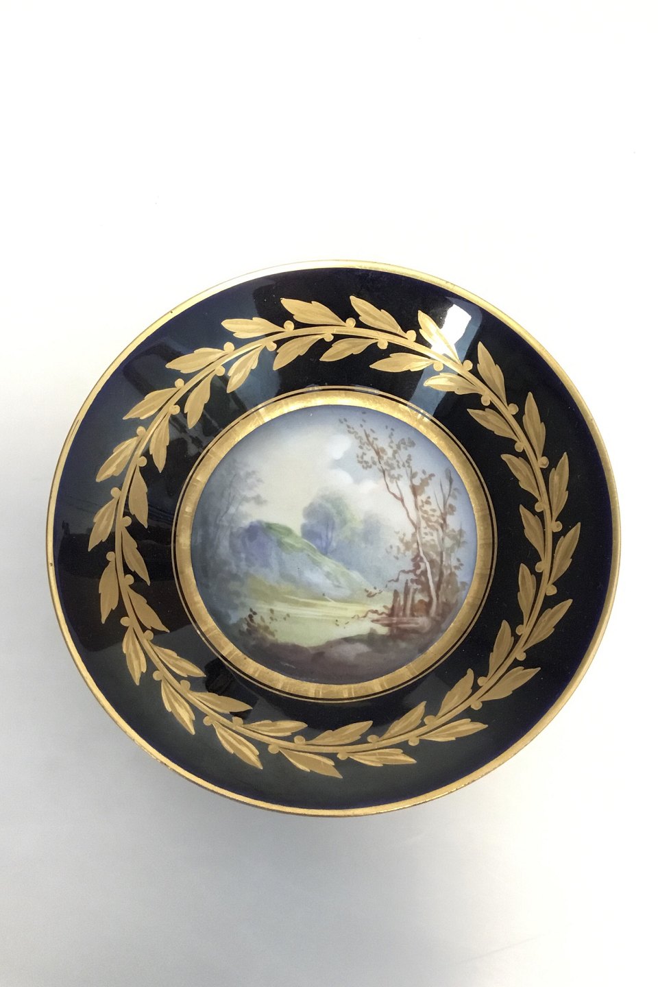 A Sevres Porcelain Cabinet Cup and Saucer, 1844. The dark blue and gilt cup with a scenery of a woman and a gentleman in the gardens. The saucer with landscape and a river. Both with factory mark and date and "S.37". Height of cup 7 cm (2 3/4")