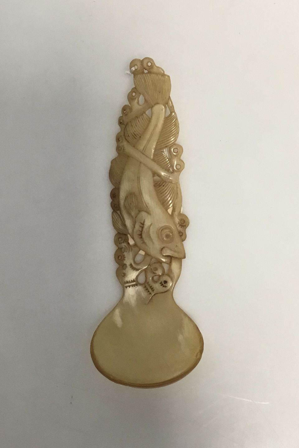 Islandsk udskåret ske i horn, fiskemotiv. L: 12 cm
