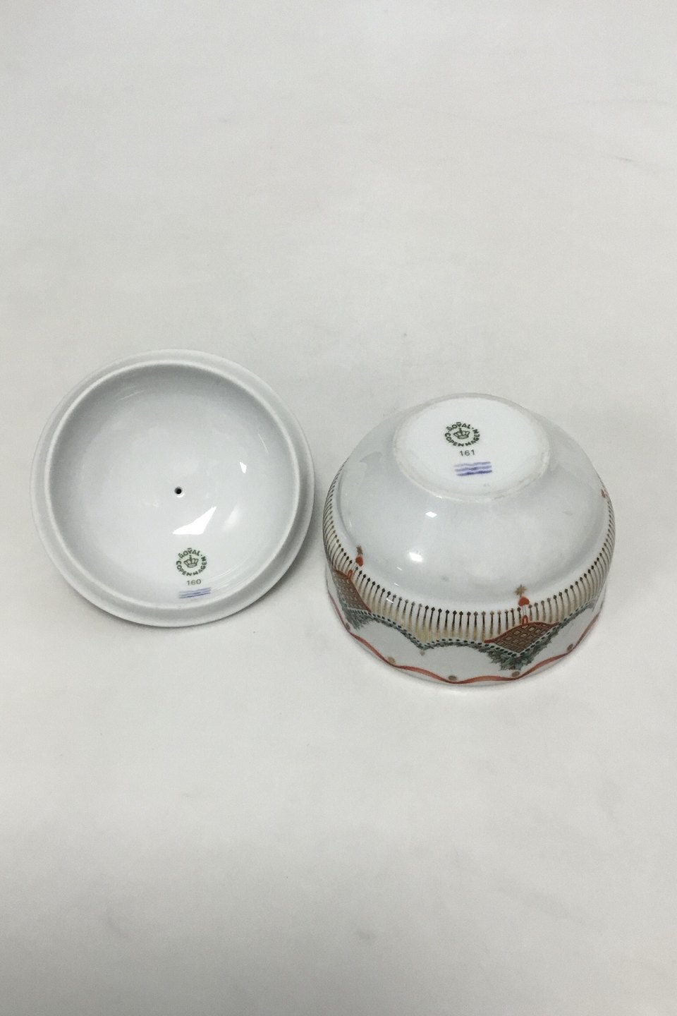Royal Copenhagen Christmas Joy Sukkerskål i porcelæn med dekoration i form af mistelten. Låg med nr. 160, skål med nr. 161. H: 10 cm, Dia: 10 cm.